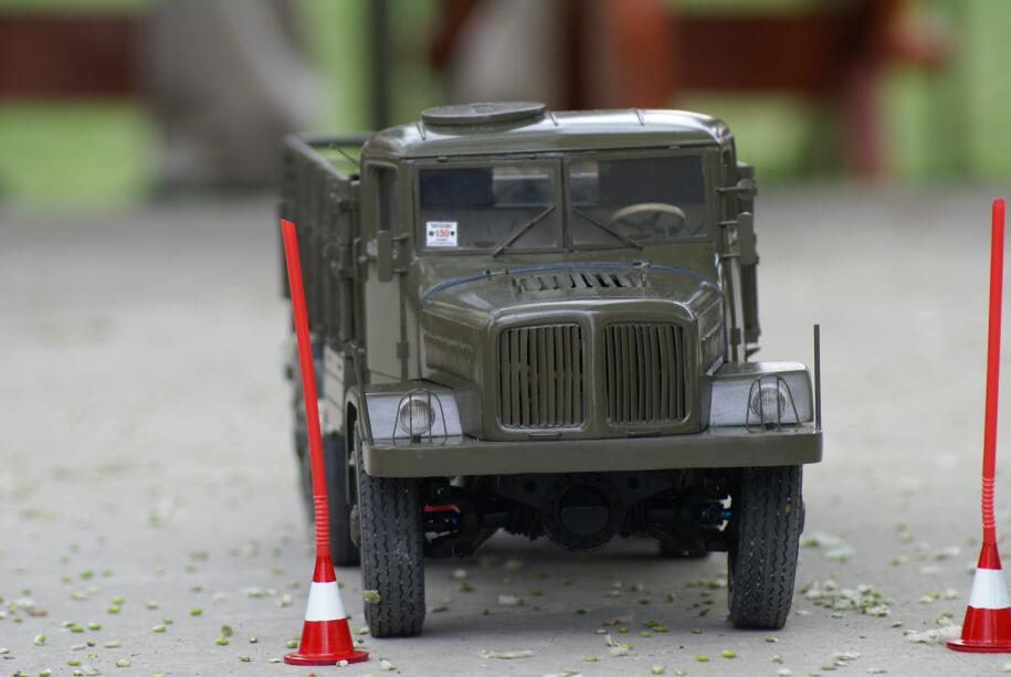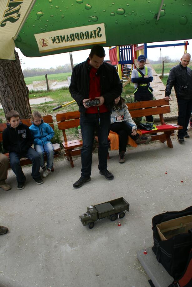 Oběd jsem do sebe naházel, ani nevím jak, a vyrazil jsem připravit jízdu zručnosti. Vše byla čirá improvizace, připravené byly pouze modelové rekvizity... Pomocí stolů a lavic jsme vytvořili vyhrazený prostor pro soutěžní jízdy. Na uvolněné betonové ploše jsem pak pomocí kuželů vytýčil garáž, tři průjezdné branky a na konci trasy jsem položil zjednodušený "ponton". Úkol byl následující – projet trať z garáže, mezi brankami z kuželů na ponton (trefit se na zvýšené pásy). Tam zařadit zpátečku a totéž zpět do garáže.