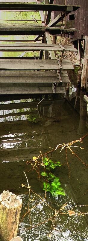Detail mlýnského kola ... v průzračné vodě rostou lekníny...