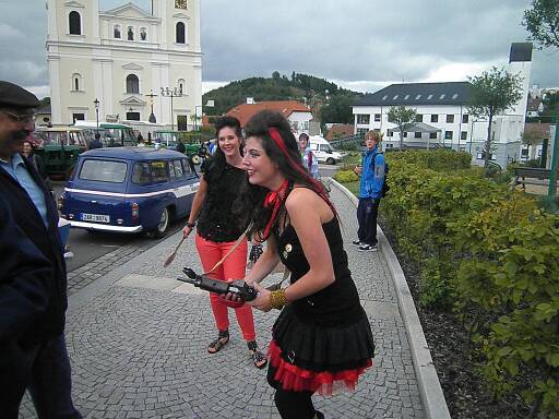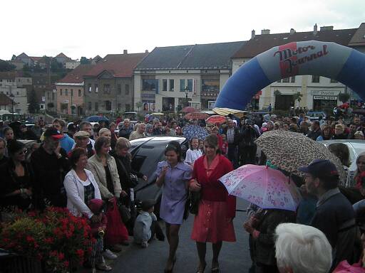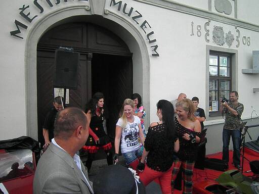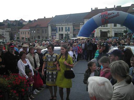 Okolo dvanácté hodiny se obloha zatáhla ... a začaly proslovy :) . Hlavní organizátor a předseda bystřického Tatraklubu, František Prosecký uvítal účastníky i diváky srazu. Pak předal slovo starostovi Bystřice. Starosta nezapomněl připomenout, kterak město podporuje místní Tatraklub a tuto akci. Paní Baxantová-Procházková uvedla další díl z tradičních přehlídek dobových šatů ze svého salonu. Minulý ročník skončil léty šedesátými, letošní přehlídka navázala šaty ze sedmdesátých let. Na úvod vyběhly děti v dobovém cvičebním úboru. Následovali je mladí pionýři. Pak kordónem diváků prošly modelky ve svatebních šatech a zamířily mezi vystavené veterány. Zájemci tak měli dost času a prostoru nafotit si je třeba u svého vozu.