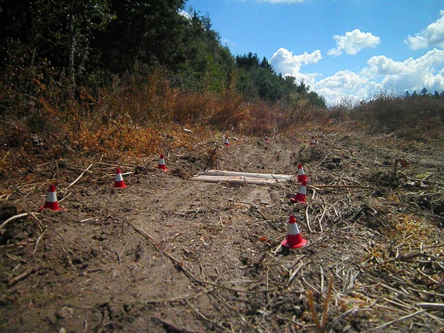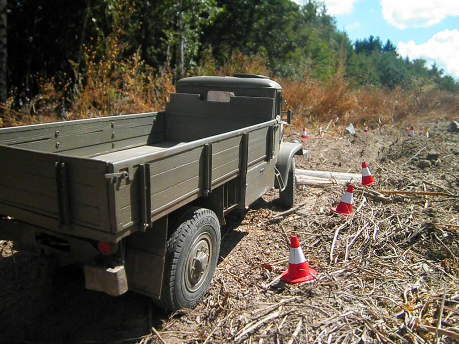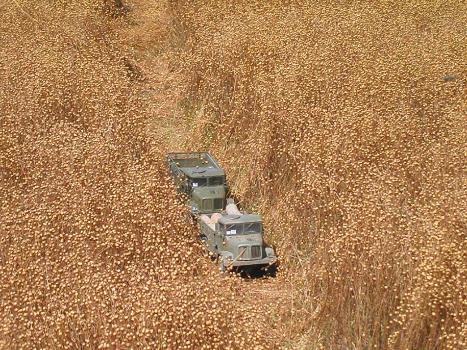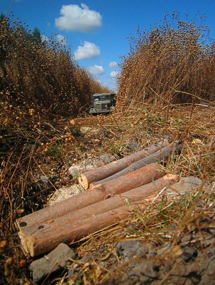 Začínáme uprostřed pole lnu. Vyjetou kolejí se blíží dvojice vzduchem chlazených osmiválců. Opatrně překračují příkop za pomoci tlustých klád.