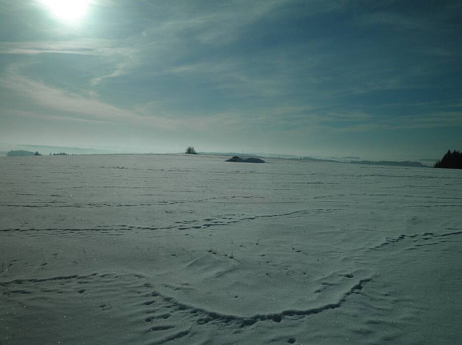 Na kopci na Novým Městem se nám ale naskytl pohled na zcela zasněženou zimní krajinu, jako kdybychom právě vystoupali někam do hor. Jako základ to vypadalo dobře až na to zamračené nebe...