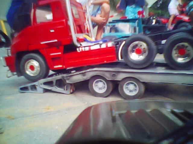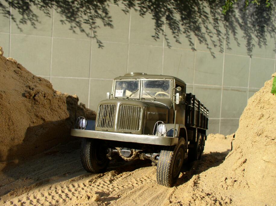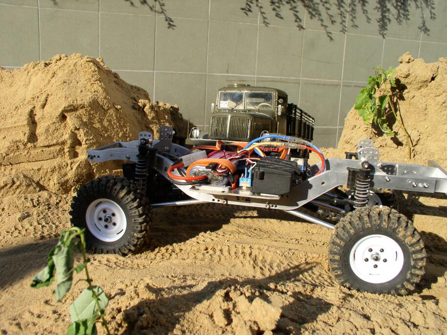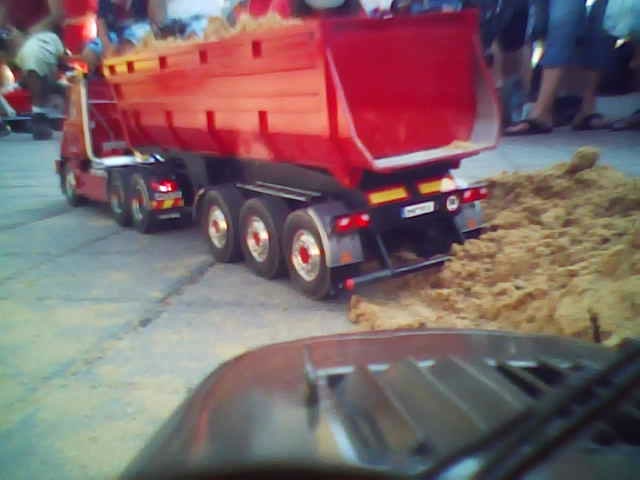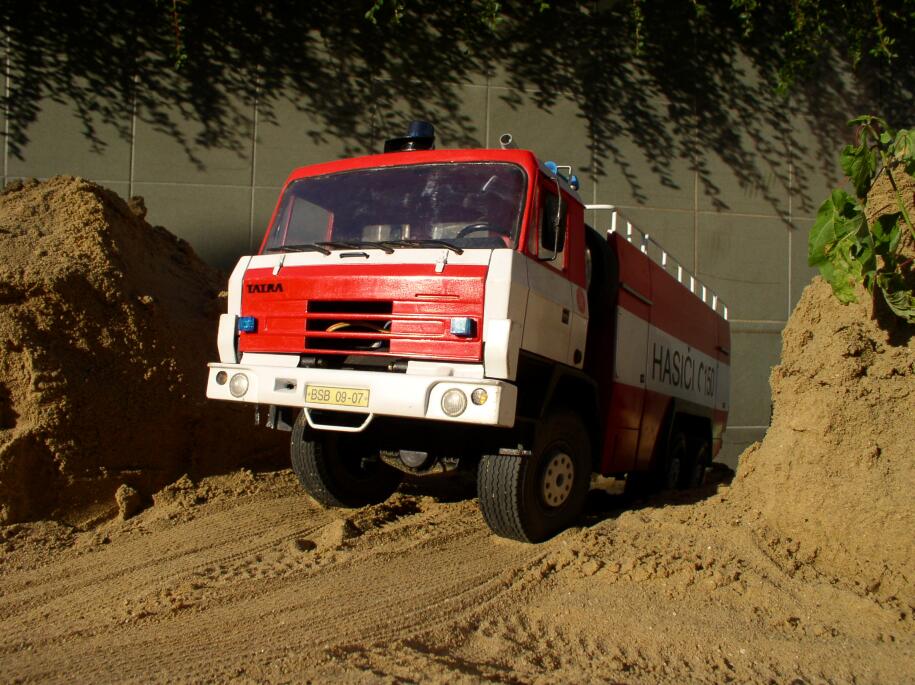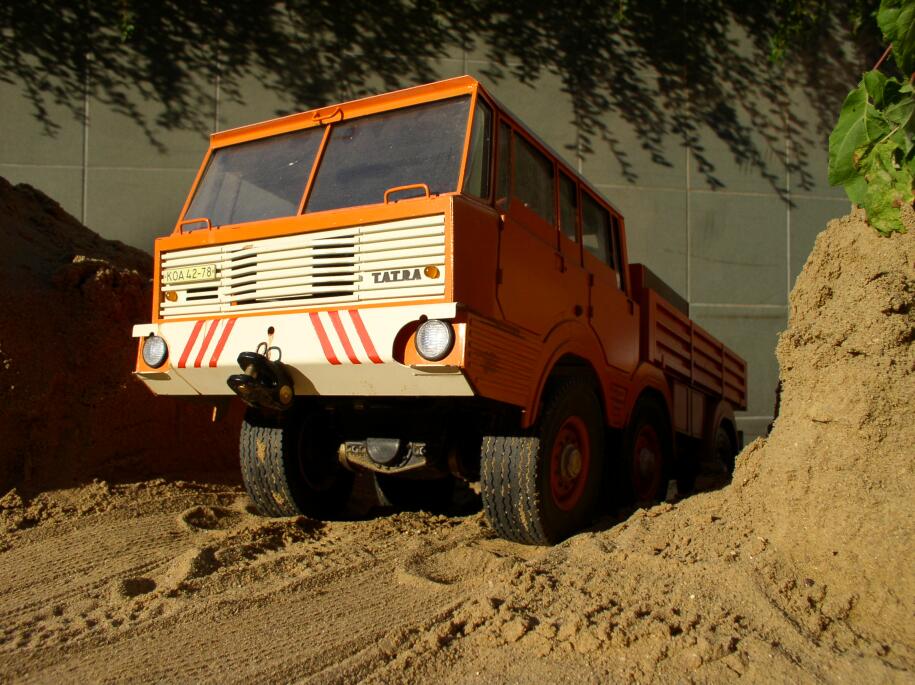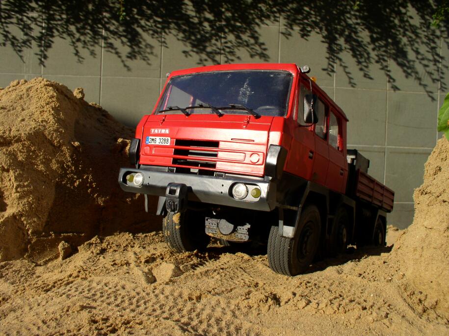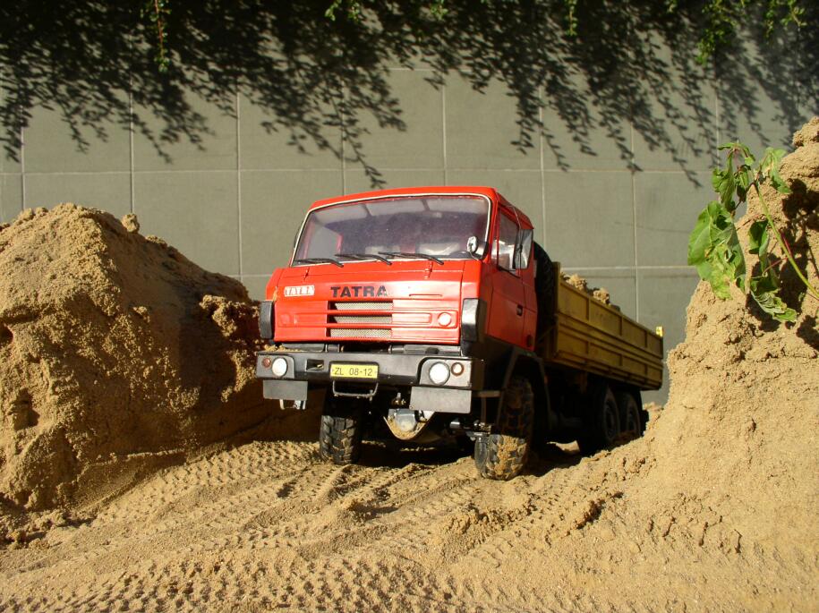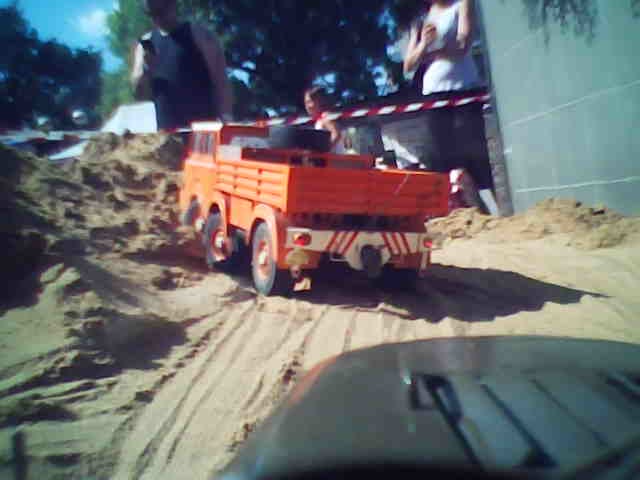 Martin předváděl svůj nejnovější podvozek – tak trochu mimo "soutěž", neboť zvány byly výhradně modely Tater. S uzavřenými diferenciály a kvalitním terénním vzorkem pneumatik samozřejmě neměl v písku konkurenci. Martin pronesl něco ve smyslu, že by se tento podvozek hodil na Tatru 805. Nejprve jsem mu špatně rozuměl, ale to tedy ani omylem – tohle je podvozek na Land Rover, to znám, to už jsem někde viděl v trochu jiném měřítku :) . Pokud by to měla být Tatra 805, tak by to muselo mít kyvné polonápravy, rouru, redukce v kolech (!) a odpužení zkrutnými tyčemi. Jinak to bude jen a pouze "tuzing" nějakého Land Roveru...