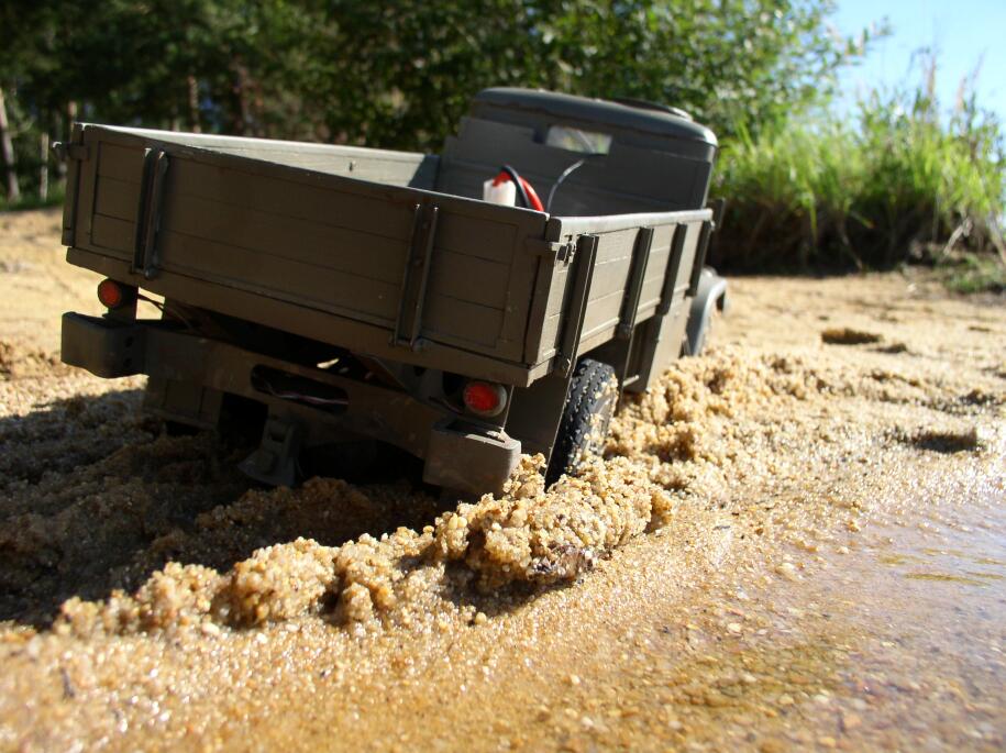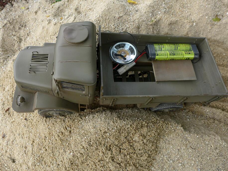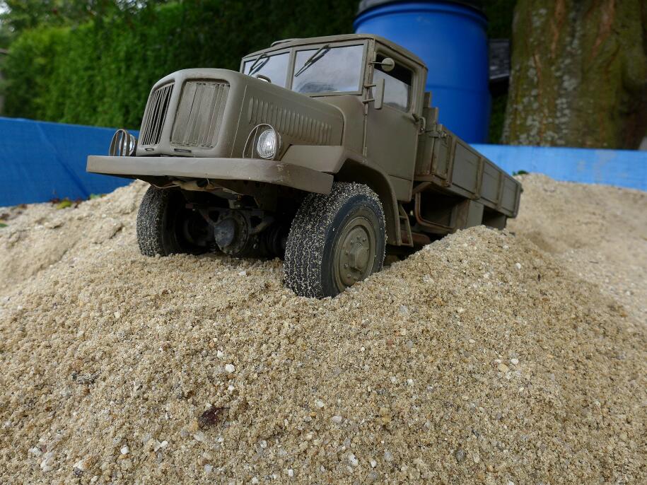 Každopádně tak prudkou "inteligenci" regulátoru jsem fakt nečekal. No nic, vyřešeno, teď už je Tatra hodná, konečně testy dopadly dobře. Tatra jede a teď už i pokojně stojí, když je motor vypnutý, nebo je vyřazeno. Při těchto úspěšných testech mi vyžrala 2 baterky – nejdřív dorazila svoji a pak ještě zhltla zbytek baterky T130 z Kopřivnice :) . Teda ale byla to pakárna vyjet s ní až nahoru na písek :) .