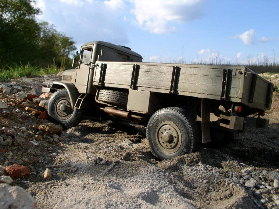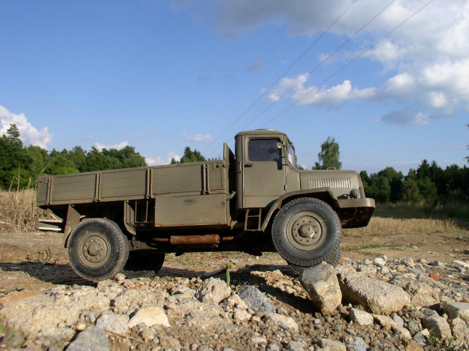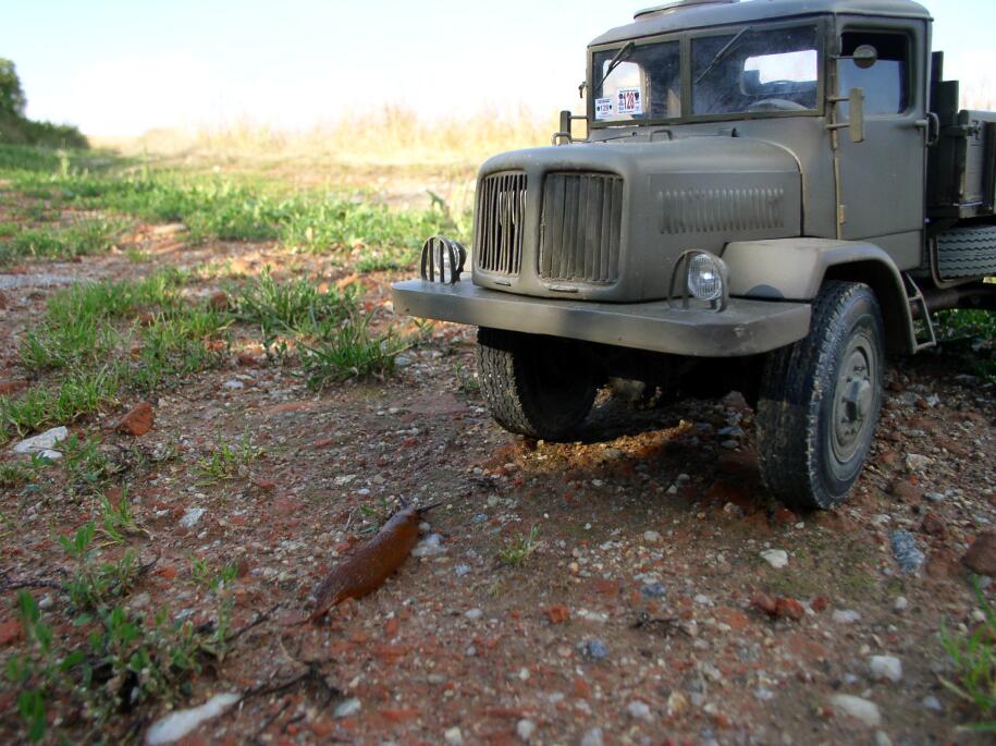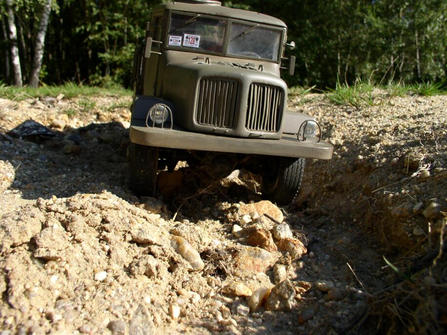 Tatra se chová znamenitě. Už to není to trhaně jezdící neschopné "ošklivé káčátko". Už je to labuť a je skutečnou lahůdkou s ní jet. Tedy ne, že by ztratila něco ze svých skvělých země-vrtných schopností, kterak se bleskurychle a beznadějně zakopat v písku na rovině :) . To tedy ne, ale pokud se jí zrovna terén nesype pod koly, tak se v něm i na malou jedničku pohybuje velmi ochotně a plynule. Lehké přidání plynu jemně otočí převody, skoro bych řekl, že lépe než na T130. Vyjet pomalu na ten šutr nebyl žádný problém. Pomalá jízda v kamenitém terénu rovněž žádný problém – stačí lehce přidávat plyn a Tatra se pomalu převaluje přes kameny.
