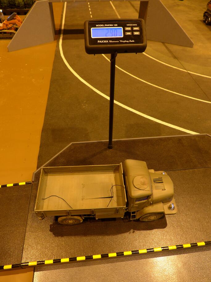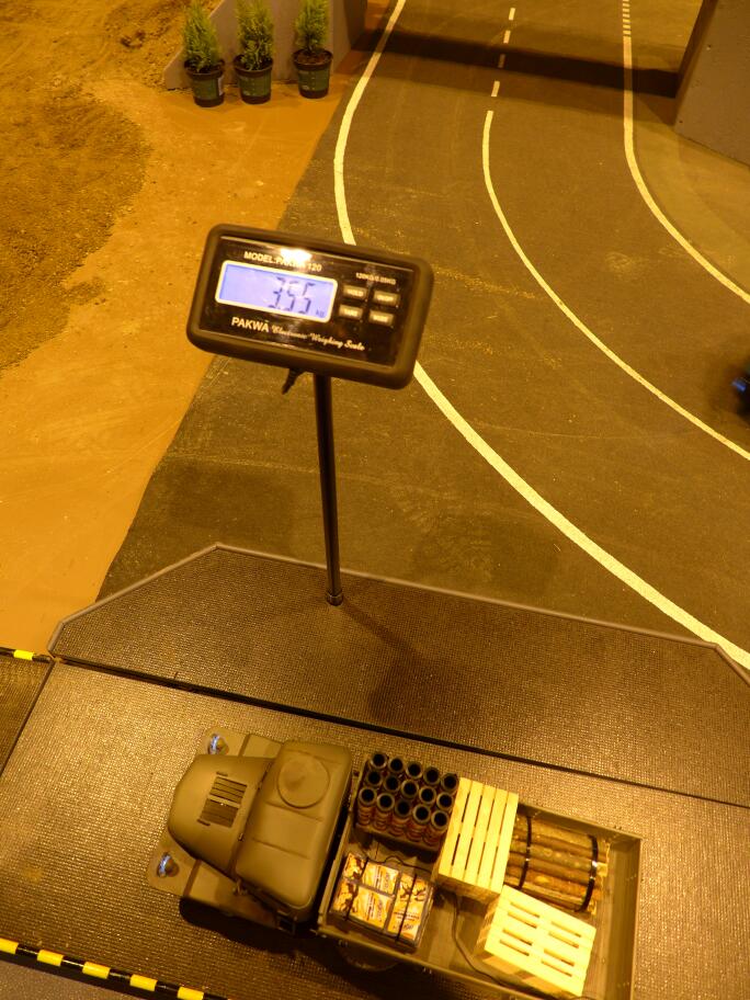 K dispozici byla i váha – takže aktuální stav je u prázdných Tater: T128 2,9kg, T130 3,7kg. To je přepočteno do skutečnosti 7,96t a 10,15t. Ano, jsou trochu těžší, než by ve skutečnosti měly být. T128 pak vozila necelé 2 tuny nákladu ... jen tak pro chuť. V terénu zcela bez problémů, ani se mi to nepodařilo vyklopit. A pak že je T128 nevhodná do civilu pro svou výšku a podseknutá kola, potažmo nestabilitu ;) .