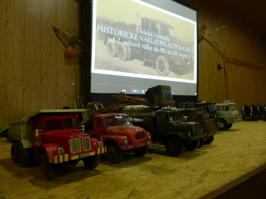 Opět se nám dostalo té cti být mezi zvanými hosty na tradiční Tatraschůzi. Naše modely jsme vystavili pěkně vedle sebe na stůl, aby si je mohli všichni prohlížet. Po chvilce se za nimi objevilo i promítací plátno. Úvodní ukázka z pořadu "Historické nákladní automobily" se k vystaveným modelům hodila velmi pěkně.