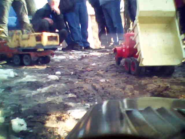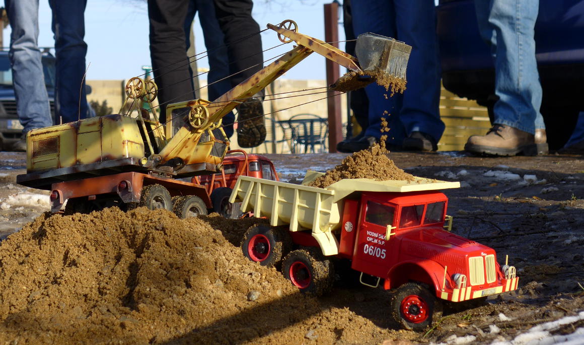 Po obědě jsme vyrazili ven. Hlavní pozornost byla samozřejmě soustředěna na soupravu T147 a lanový autobagr T138. "Laňák" se spokojeně zakusoval do hromádky písku venku u rybníka a plnil dumpcar T147. T130 a T813 se projížděly okolo.