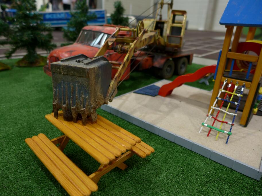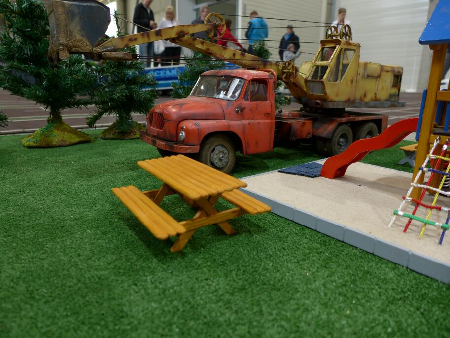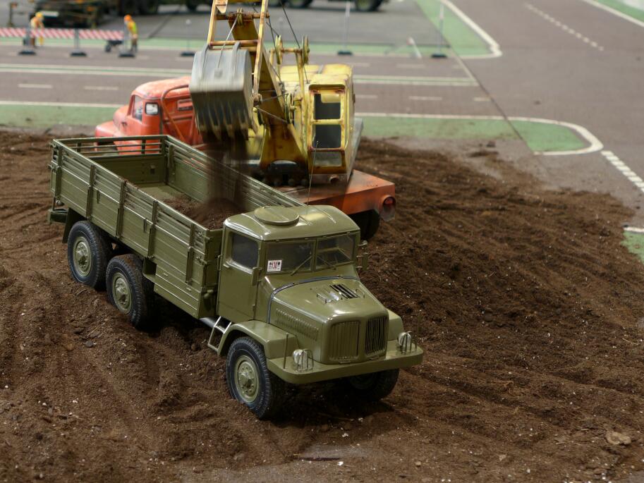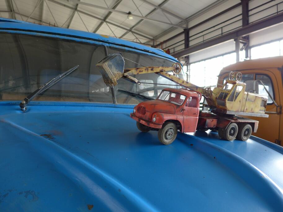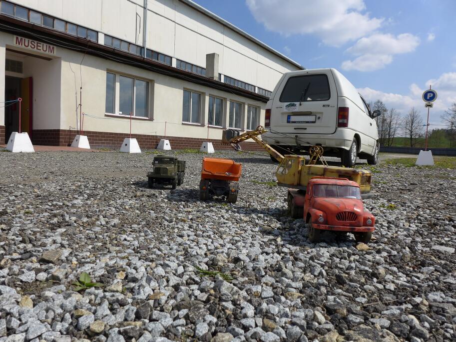 Pak jsme postupně nanosili modely dovnitř muzea a v přátelské atmosféře jsme během jejich prezentace vyslechli bezpočet historek z dob budějovického ČSAD. Vyfotili jsme taky společně T138 lanový autobagr se skutečnou sklápěčkou T138, jejíž kabina byla předlohou pro modelovou kabinu bagru.
