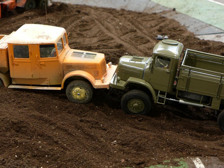 Zpočátku to sice vypadalo, že budou jen asfaltové silnice, ale pak přeci jen borci vysypali rašelinu. Samozřejmě jsme se na ni vrhli jako supi. Bylo zajímavé pozorovat, o kolik jsou Tatry v terénu schopnější, než konkurence. Pravda, zde vyskytující-se konkurenční sklápěčky neměly uzávěrky. A tahače nás jen smutně pozorovaly z bezpečné vzdálenosti (z asfaltu :) ).