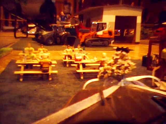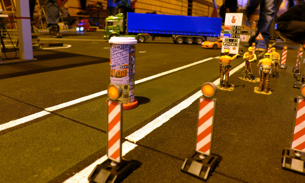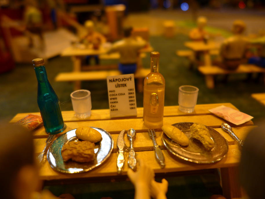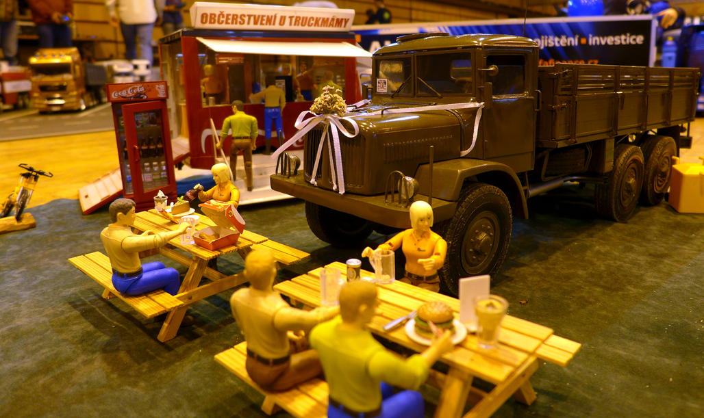Modelovou krajinu opět doplňovaly krásné statické dekorace. Nemohl jsem si nechat ujít svačinku ... Když jsem najel k Občerstvení u Truckmámy, zjistil jsem, že s Tatrou dokážu projet mezi popelnicí a záchodky, čili si opět můžu postavit auto až ke stolu :). Dali jsme si k obědu gulášovou polévku s libovým masem a s sebou naalokovali drobné svačinky a jiné "obŽerstvení".