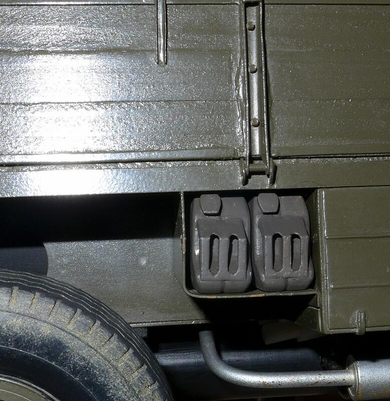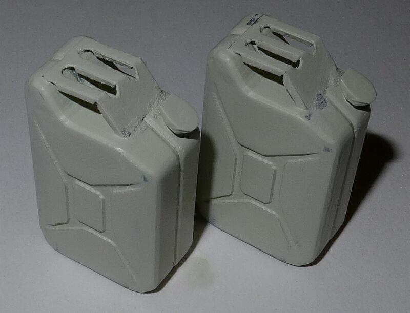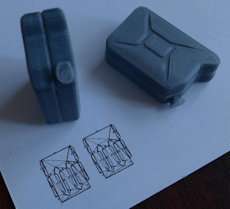 Pro svou Tatru jsem připravil 2 kanystry, ale zatím jsem nevymyslel, jak je do schránky umístit tak, aby nevypadly, a zároveň nenarušit originální vzhled modelu. Původně tam byly 2 tenké plíšky (Pepo, oba se dochovaly!), ale mám je uložené zvlášť, protože na autě nikdy pořádně nedržely. Kanystry jsem prostě vytiskl, přivařil držadlo, nastříkal plničem a natřel tmavě olivovou barvou. A abych předešel spekulacím – kanystry mají skutečně záměrně nesprávné proporce – konkrétně jejich délka je 0.857 délky skutečné. Je to proto, že schránka na T130 z nějakého důvodu nemá správnou výšku.