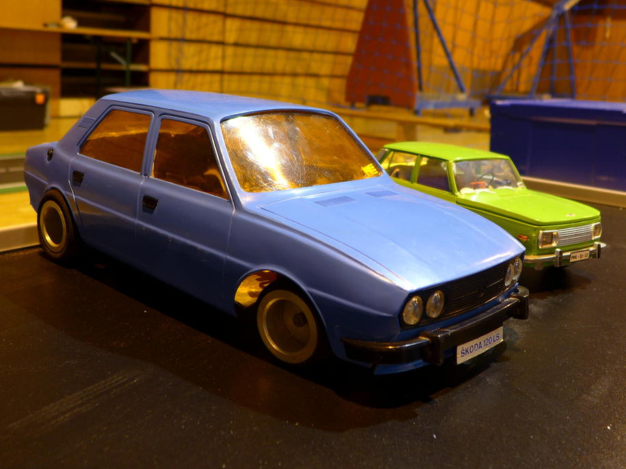 Driftovací speciál Škoda 120 LS postavený z dnes už historického modelu na "polo-dálkové" ovládání.