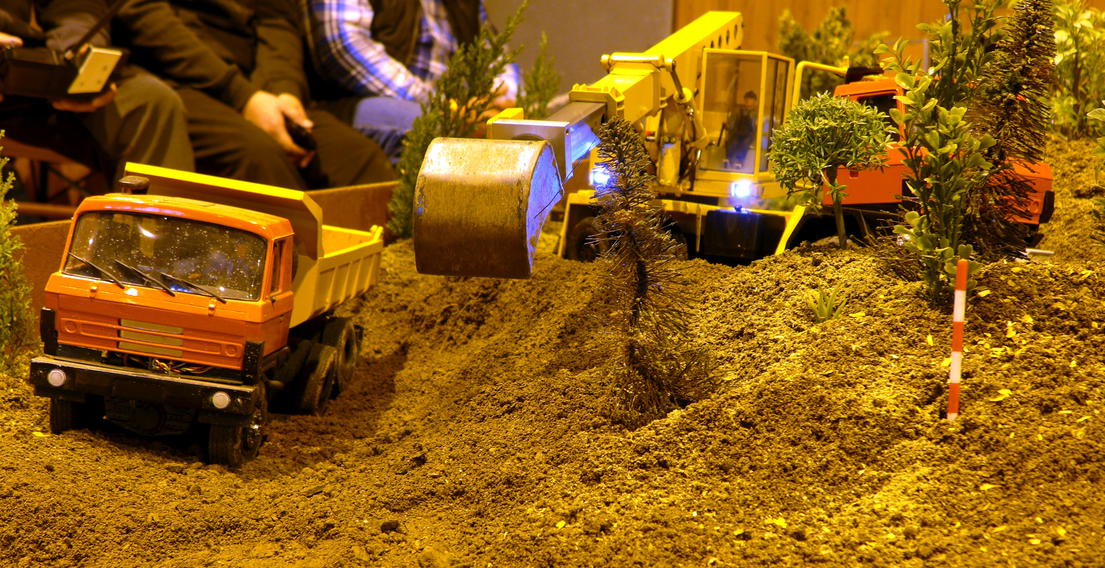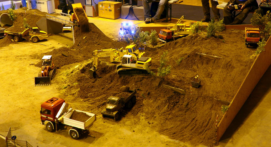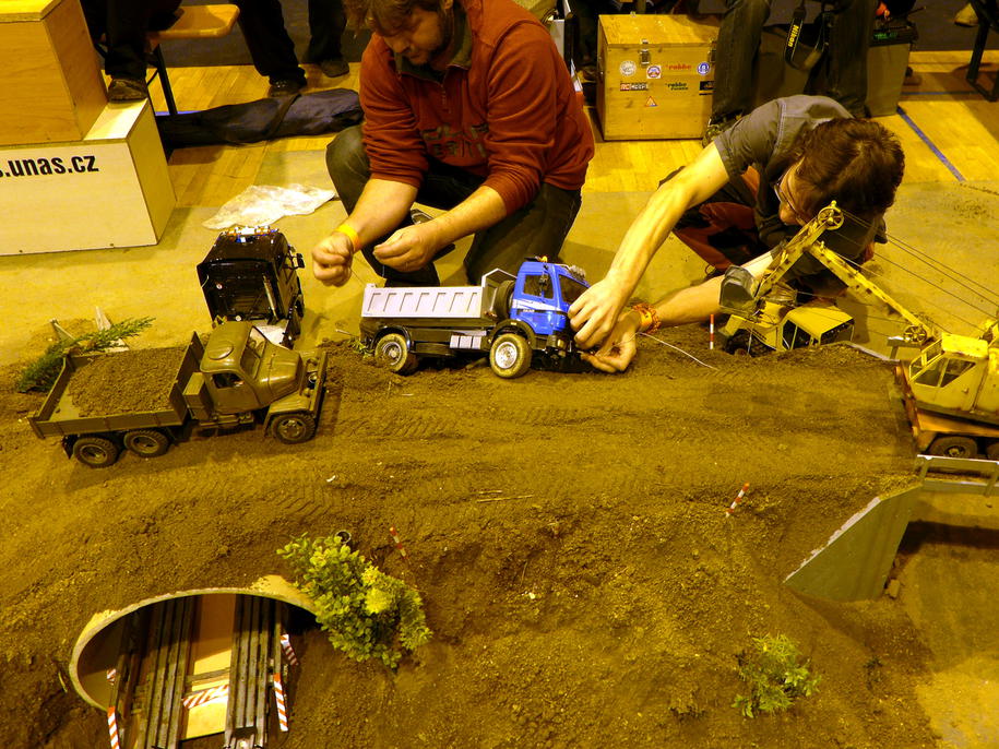 Organizace modelářů na placu se iniciativně chopil Michal, kterému se podařilo vytýčit jasný cíl – vybudovat nadjezd – a pak to ještě perfektně zrežírovat. Sklápěčky, bagry, nakladače i buldozer trpělivě spolupracovaly na společném díle. Vše se nakonec podařilo a nadjezd byl dokončen v řádném termínu a v požadované kvalitě dle projektu. Snad ani rozpočet stavby nebyl překročen. To se dnes vidí málokdy :) .