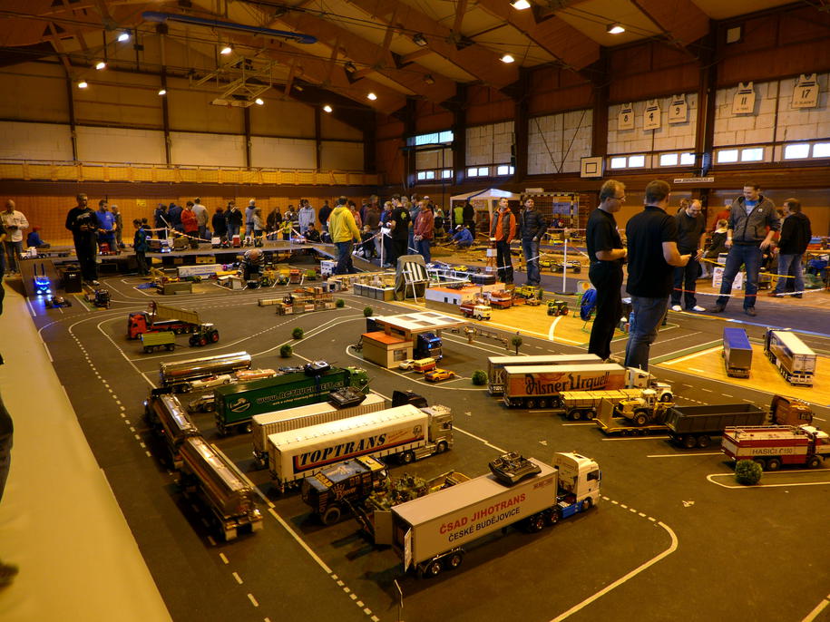 Ráno jsem měl v úmyslu vyrazit včas, abych ulovil nějaké přijatelné místo k zaparkování své "přepravky na Tatru". Do Domažlic jsme dorazili lehce po 8:00, ale to už byla okolní parkovací místa alokována jinými přibližovadly. Ono se cca 80 modelářů někde projevit muselo. Taky by mě zajímalo vytížení pásma 2.4GHz. WiFi ale v hale moc nešla, jak mi povrdilo několik lidí snažících se o online přenosy videa ze svých kamer na autech do svých mobilních telefonů. Na 40MHz jsme byli jen naštěstí jen tři.