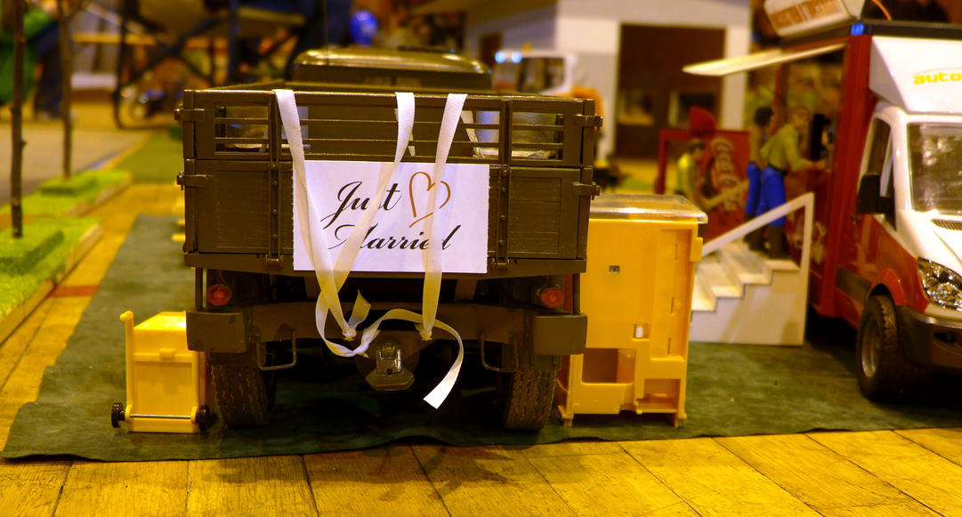 Michala jsem před akcí požádal, zda by mohl obětovat nějaké prázdné sudy od nafty. Určitě mu hlavou vrtalo, k čemu potřebuju 3 sudy a proč na nich tak důsledně trvám :) . Sudy jsme pak na místě přivázali za zadní nárazník a na zadní sajtnu přibyl plakát "Just married".
