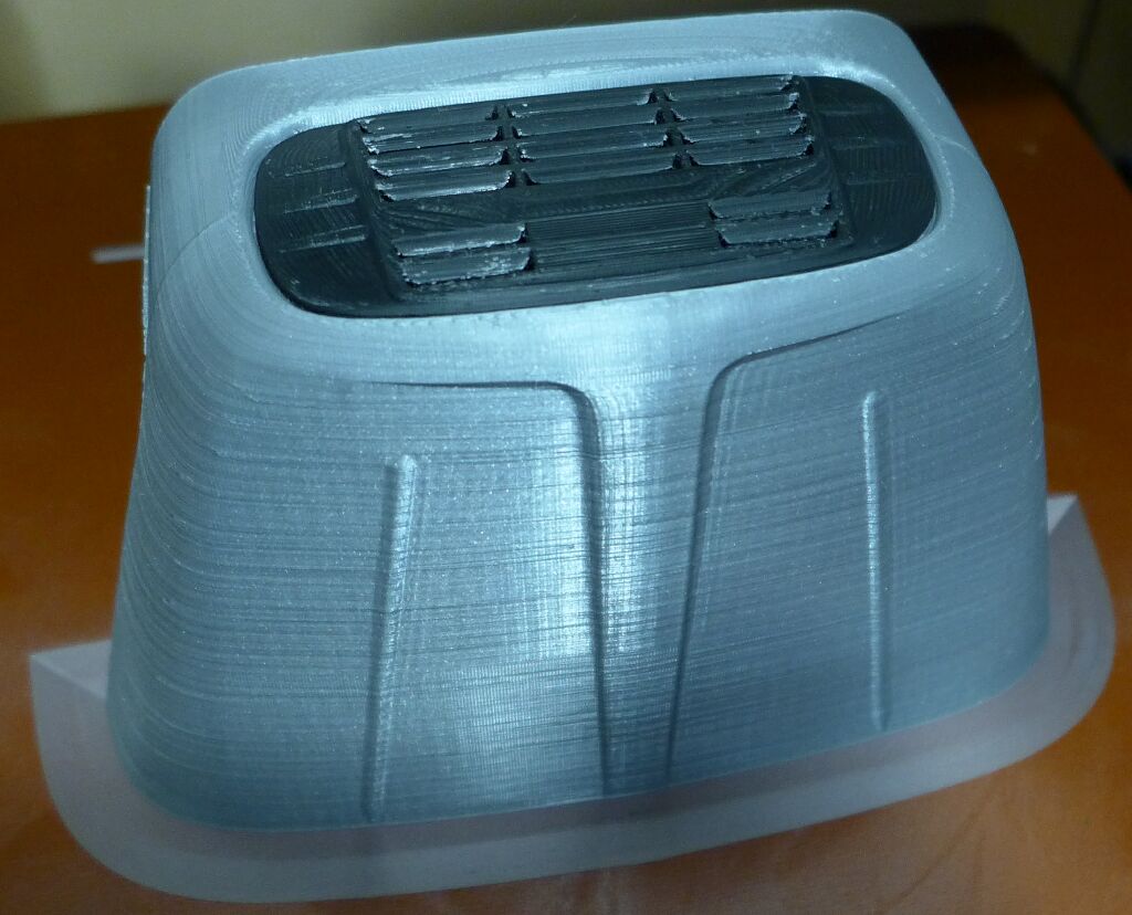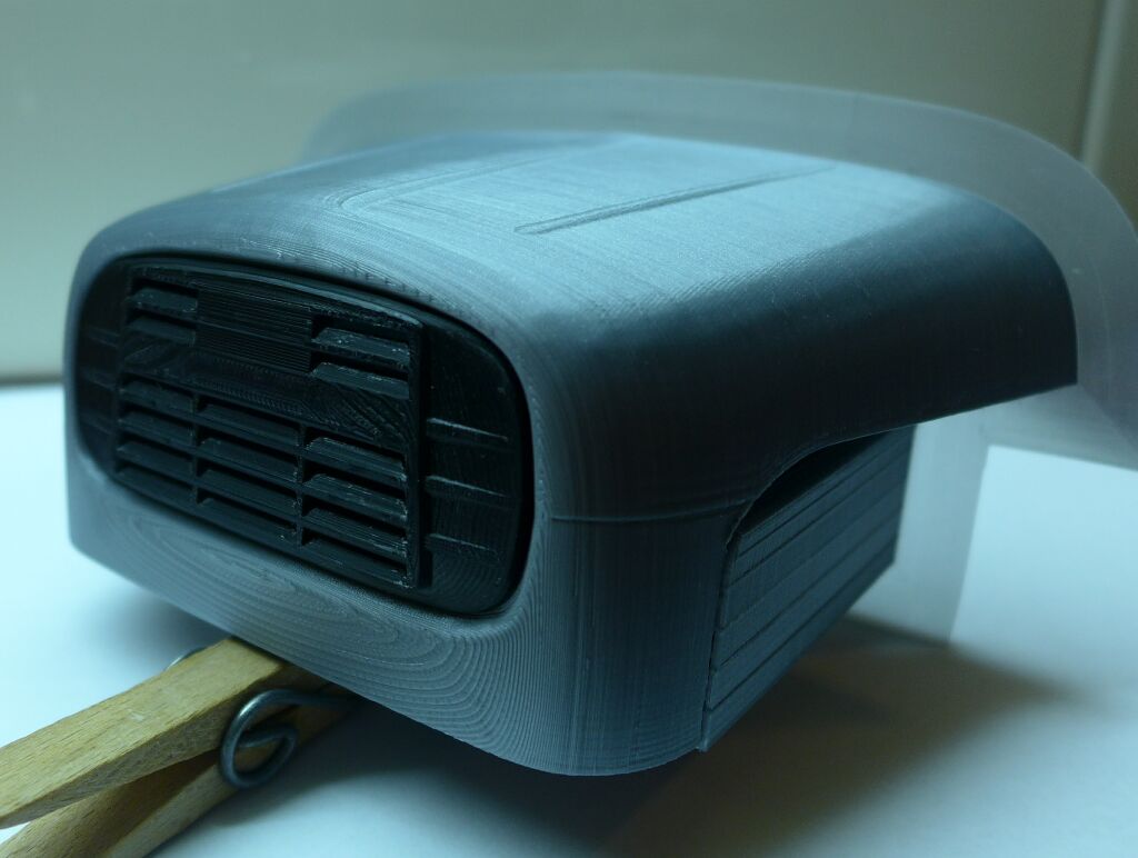 Těsně před akcí jsem dokončil 3D model a výtisk kapoty Tatry 2-148. Tisk byl nastaven záměrně poněkud hrubší (tisková vrstva 0.1mm a rychlejší tisk), neboť kapota neobsahuje jemné detaily a před zaformováním se předpokládá násřik plničem a vybroušení. Na místě jsme ověřili, že sedne na kabinu T138 zcela přesně. Součástí dodávky byly i cyklóny a maska, která je navržena jako výměnná, aby bylo možné výhledově udělat i její starší provedení. Maska byla vytištěna v nejvyšší kvalitě (0.05mm vrstva).