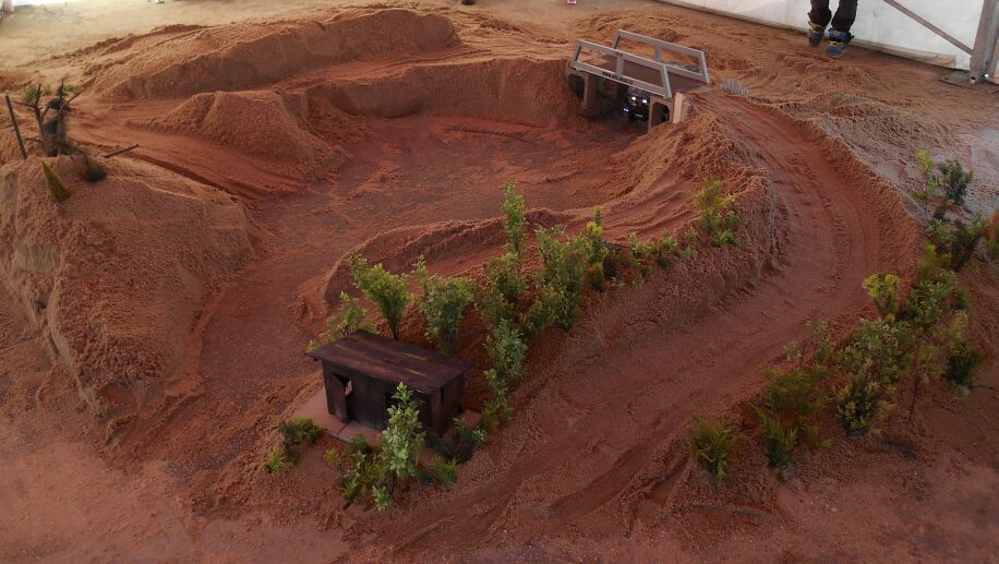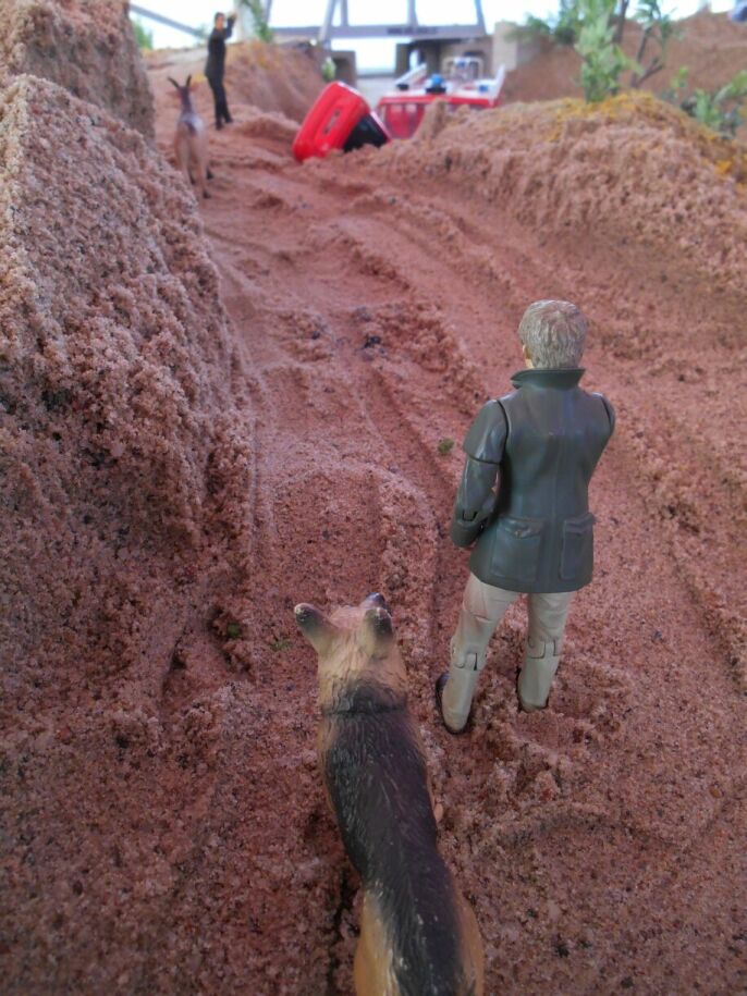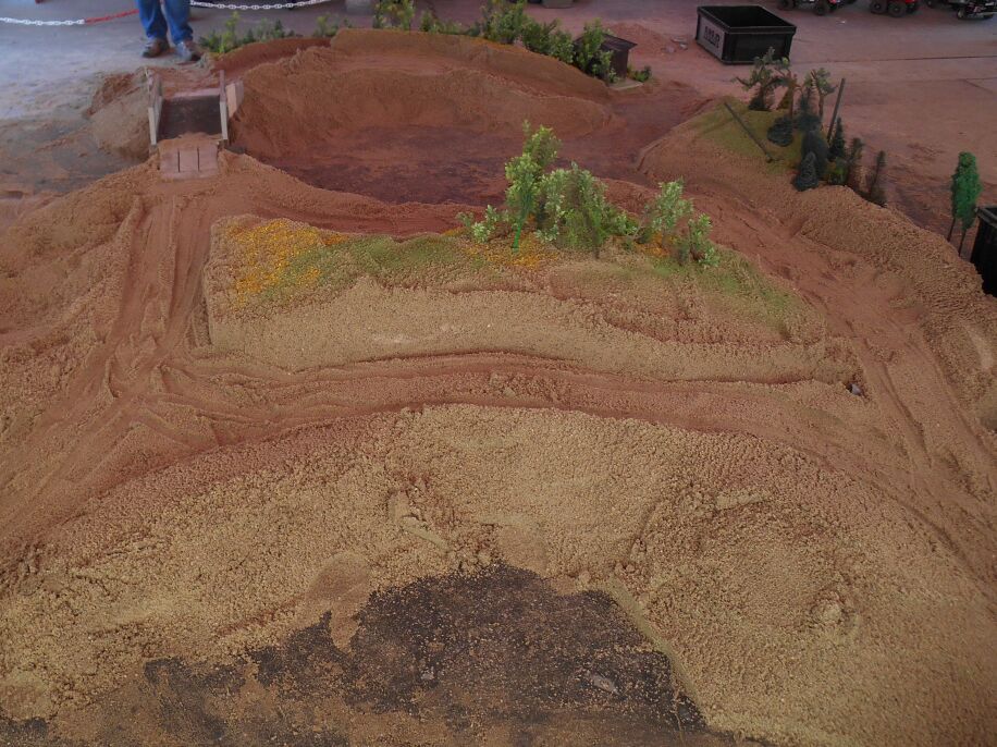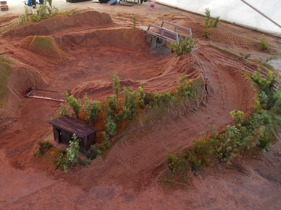 Terénu v neděli velmi prospělo vytvoření volného prostoru uvnitř pískoviště a rozházení písku okolo. Tím bylo možné přidat most a další zajímavé cesty a srázy.