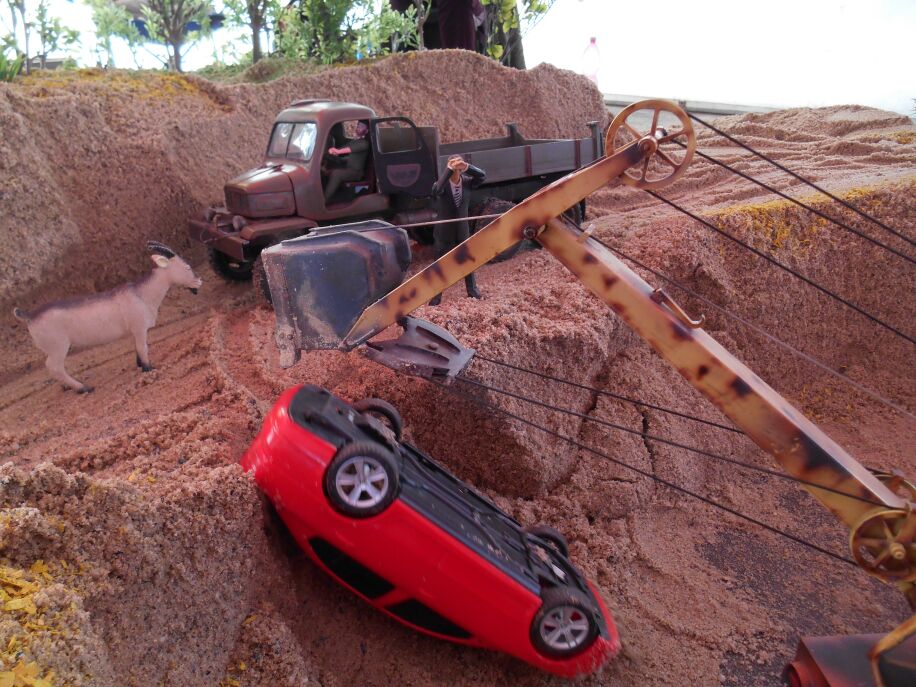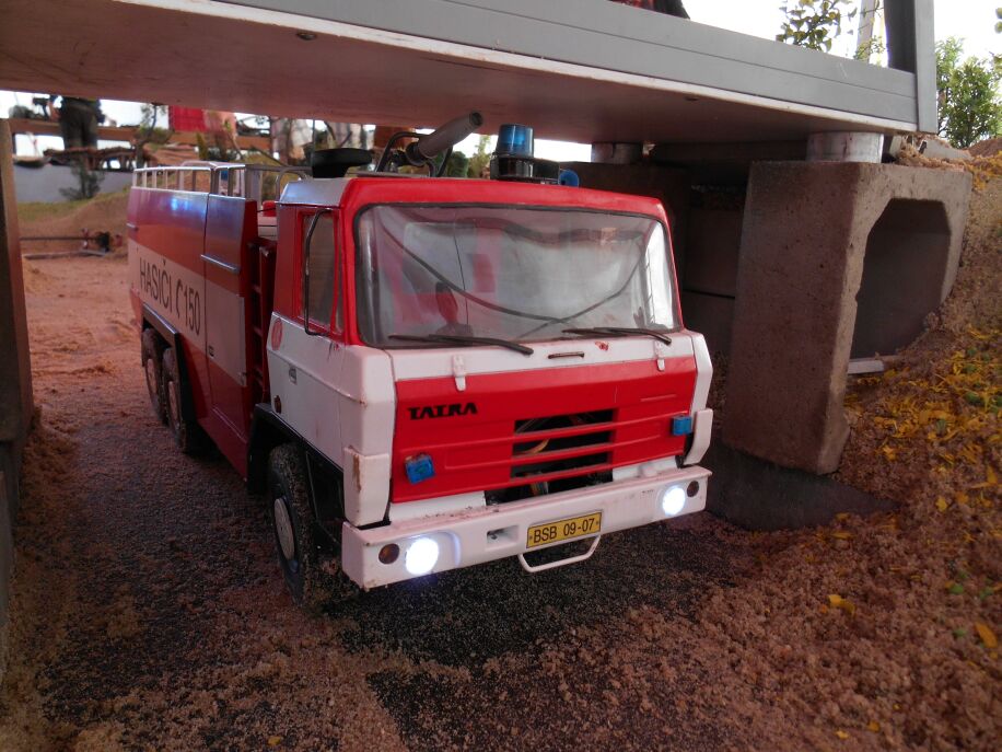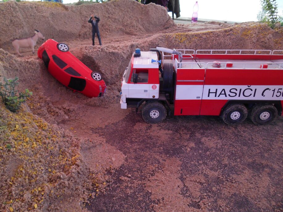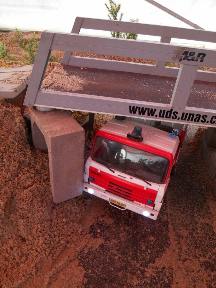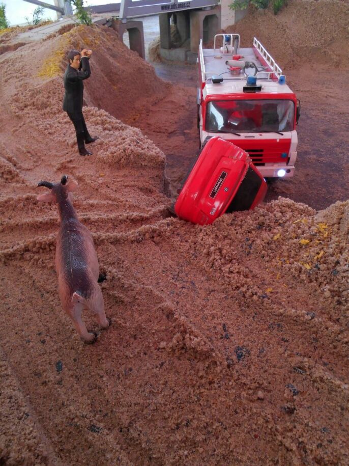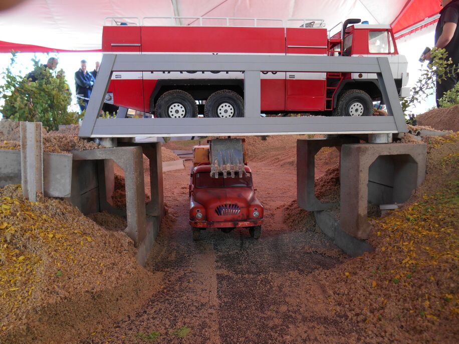 Škoda, že nebyl Miro, mohli jsme simulovat posun mostovky zvednutou korbou rozjeté T813 S1 8x8 (což se skutečně stalo, jak víme z vyprávění). Třeba by se jí taky ohnula trubka, jako ve skutečnosti :) . Hasičák se o to omylem pokusil – pilot se opět nevěnoval řízení a takhle to dopadlo.