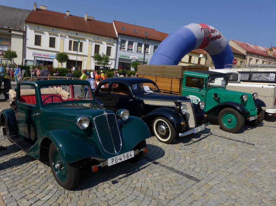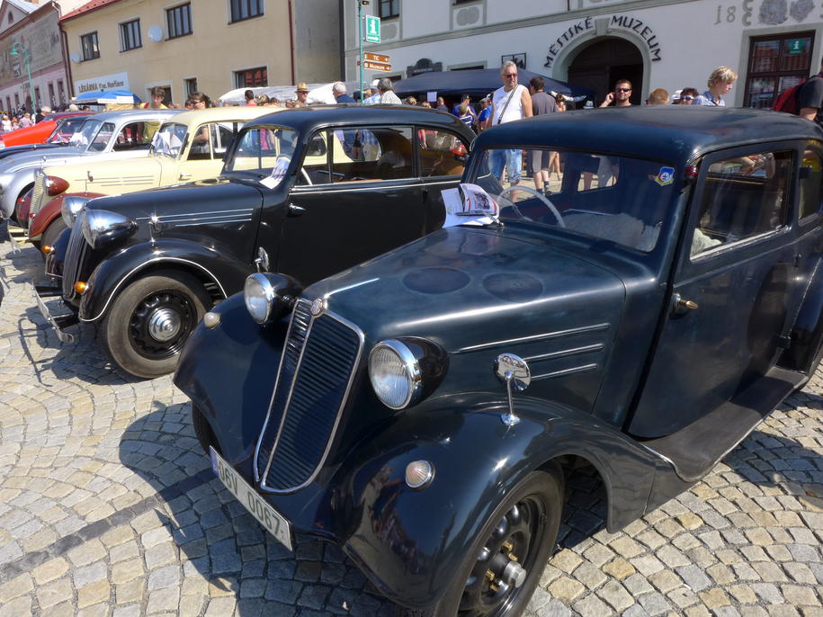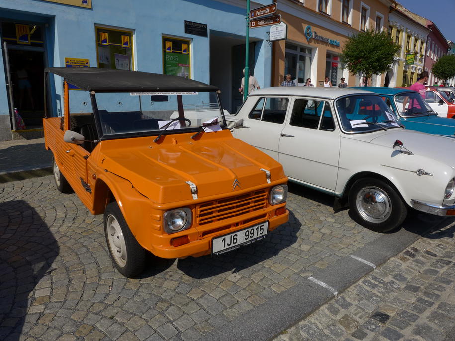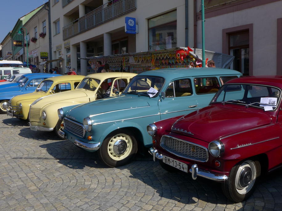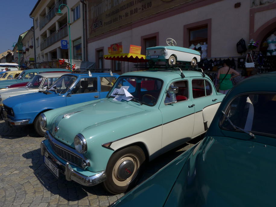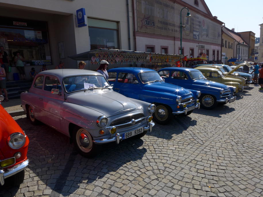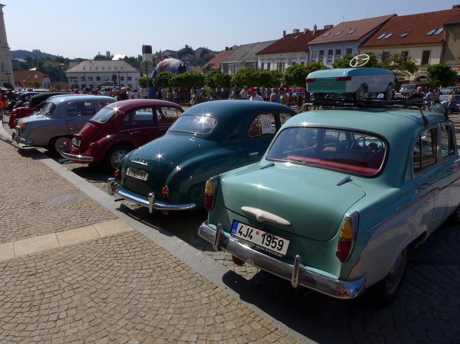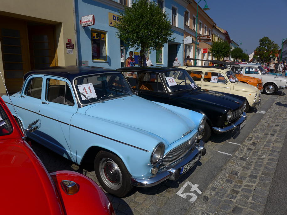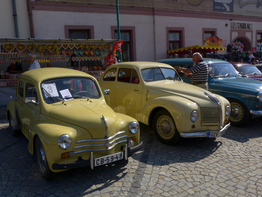 Podél východní strany náměstí stojí další poválečná vozidla. Renault byl 4CV tentokrát na srazu jen jeden jediný. Mezi "Střelenými slepicemi" bylo možné zahlédnout i variantu MBX a nebo zajímavou soupravu v podobě Škoda 1000 MB s retro obytňákem.