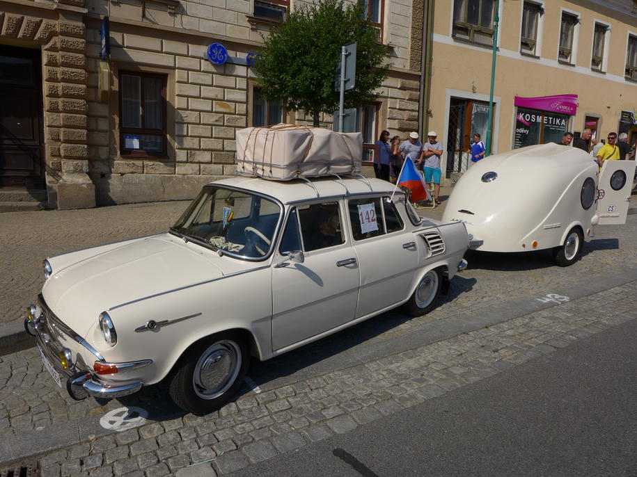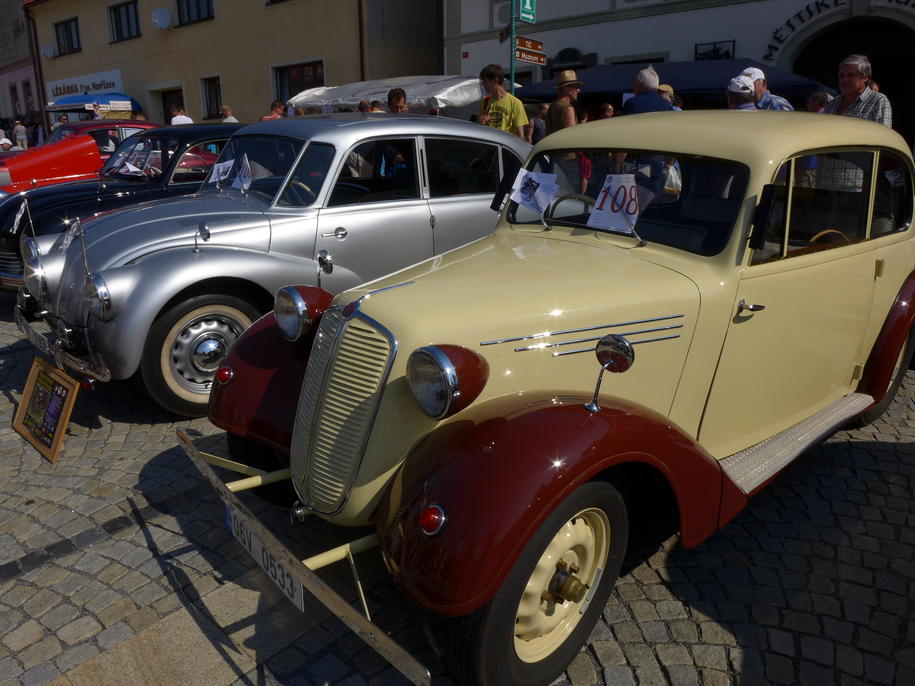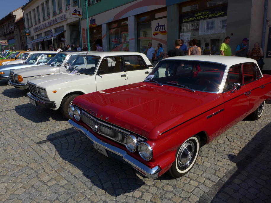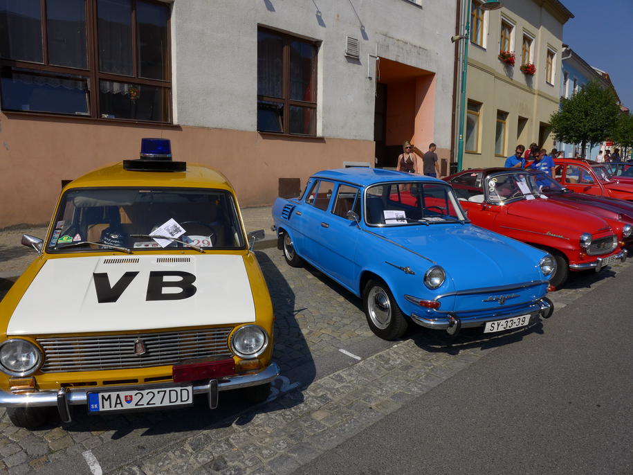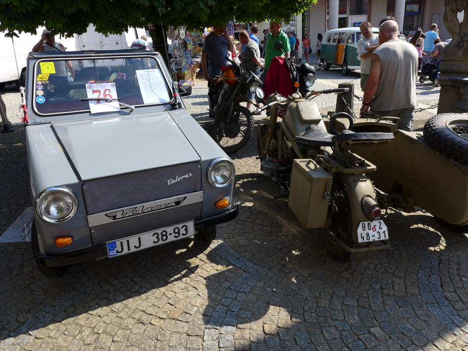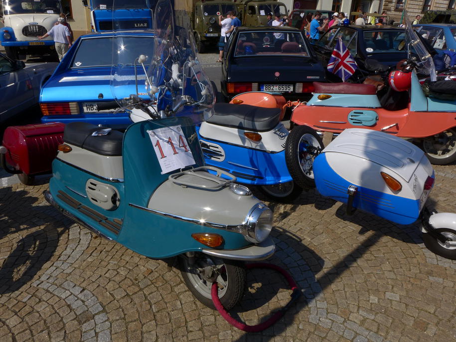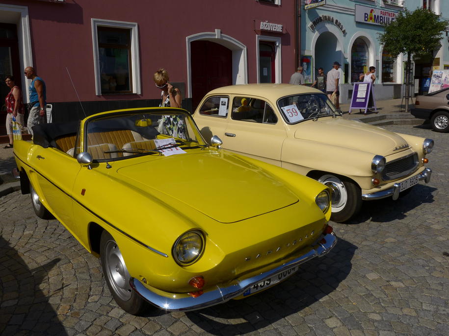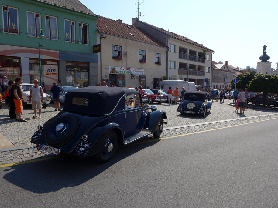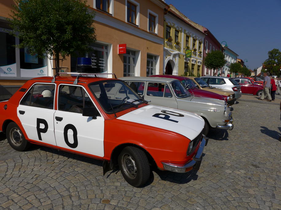 Podél východní strany náměstí stojí další poválečná vozidla. Renault byl 4CV tentokrát na srazu jen jeden jediný. Mezi "Střelenými slepicemi" bylo možné zahlédnout i variantu MBX a nebo zajímavou soupravu v podobě Škoda 1000 MB s retro obytňákem.