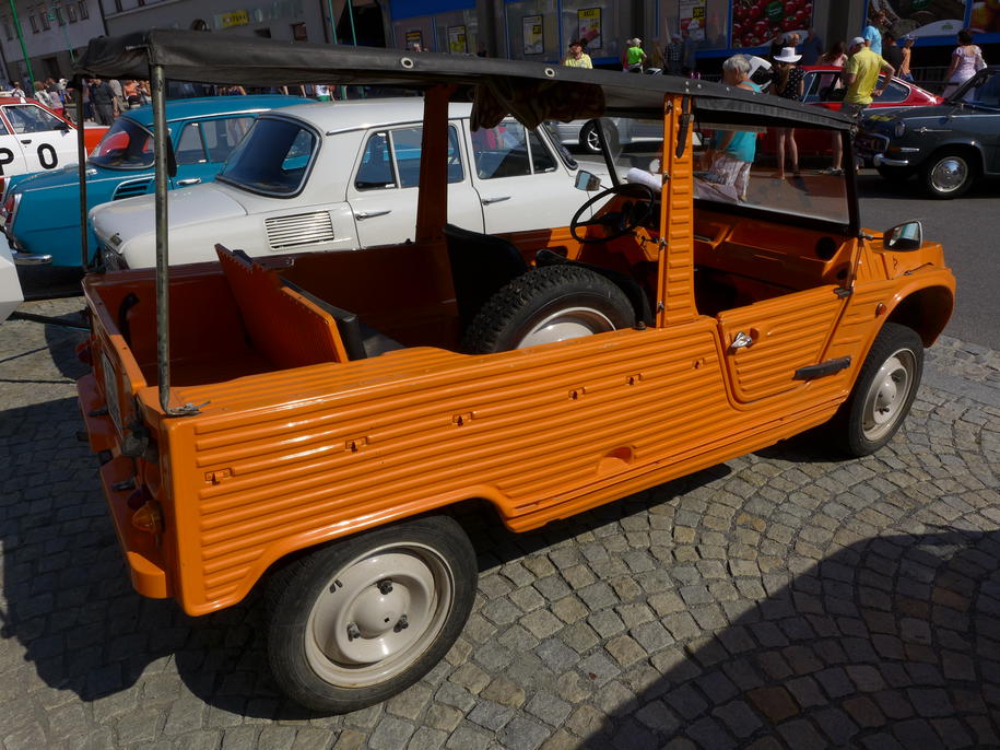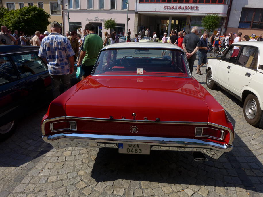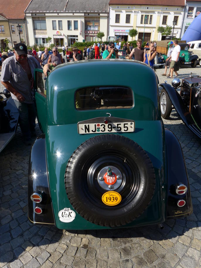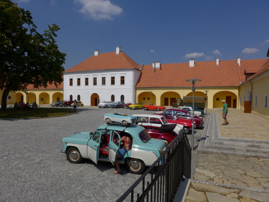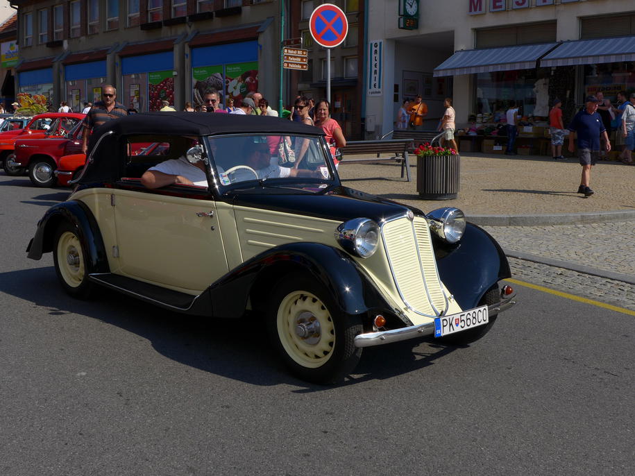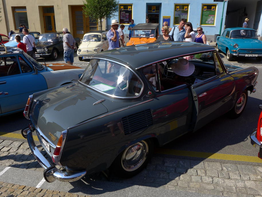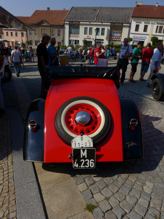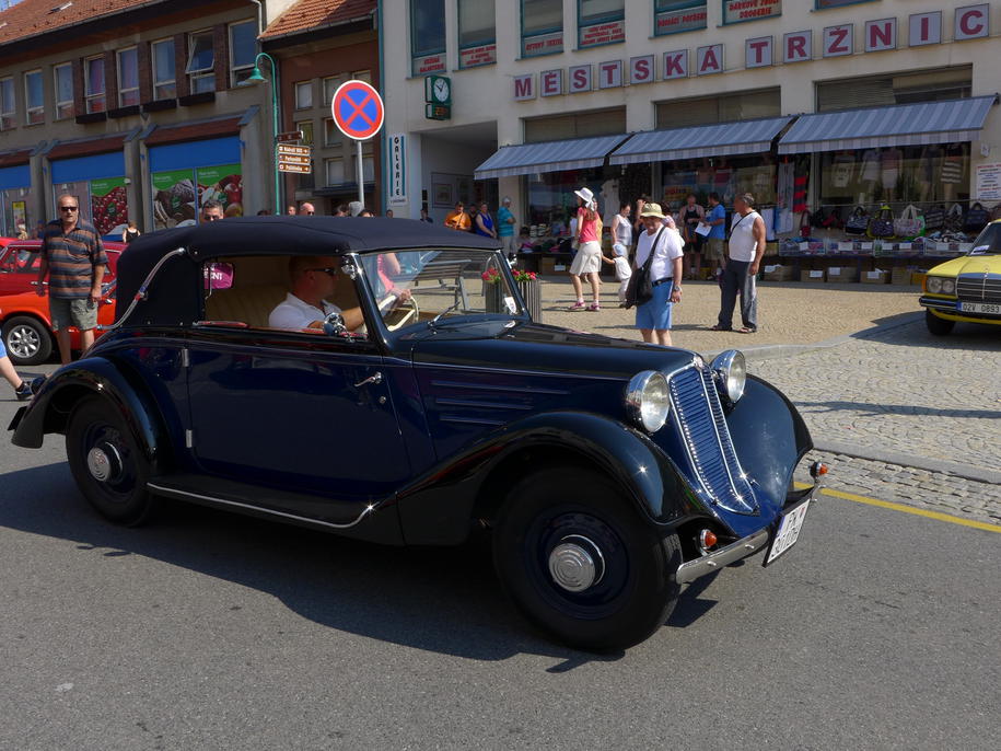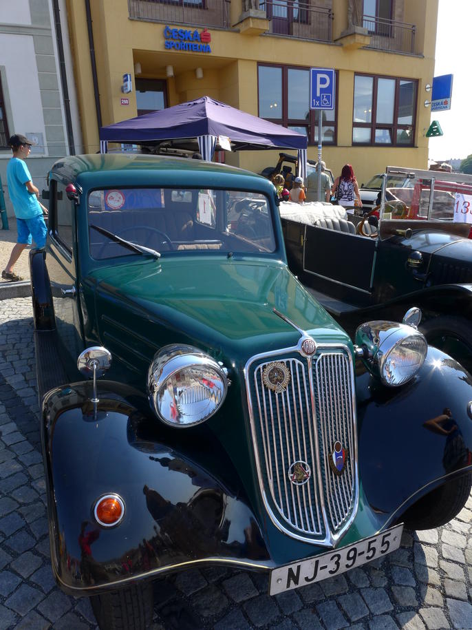 Podél východní strany náměstí stojí další poválečná vozidla. Renault byl 4CV tentokrát na srazu jen jeden jediný. Mezi "Střelenými slepicemi" bylo možné zahlédnout i variantu MBX a nebo zajímavou soupravu v podobě Škoda 1000 MB s retro obytňákem.