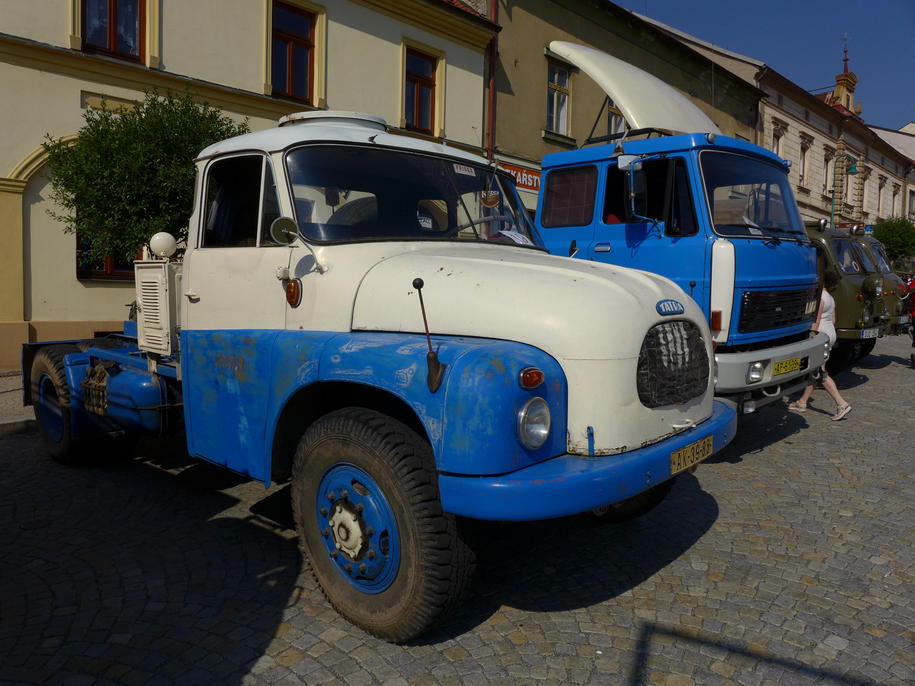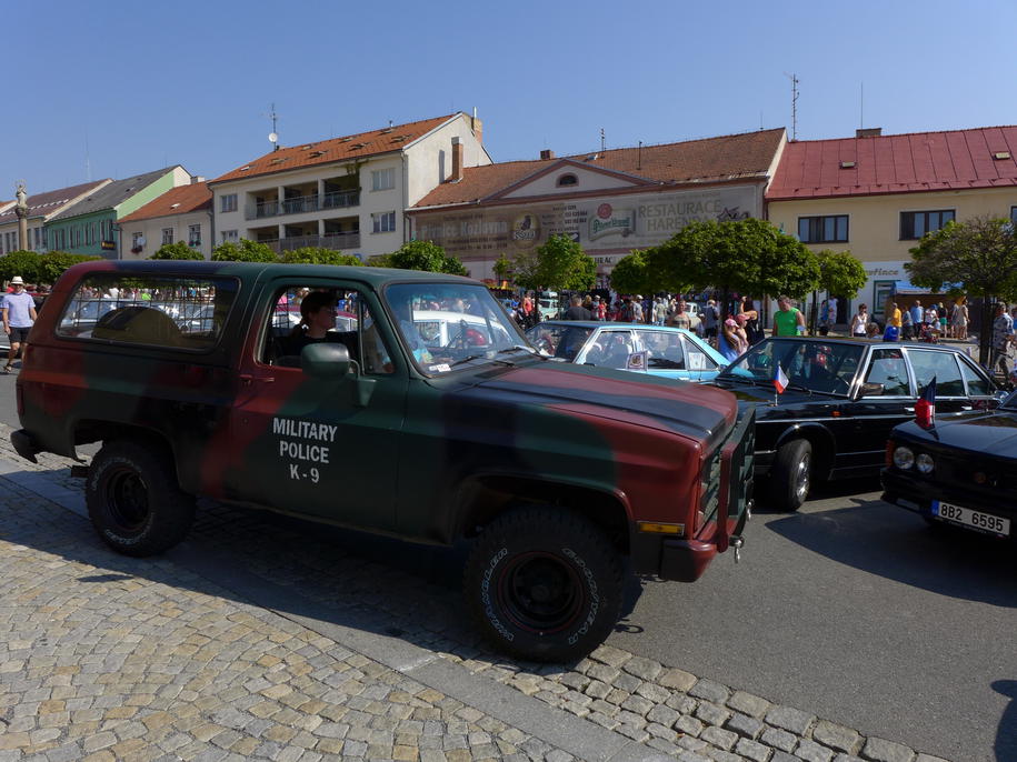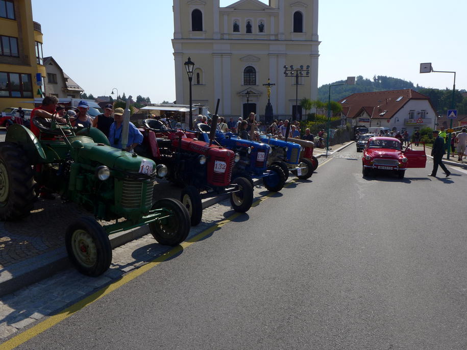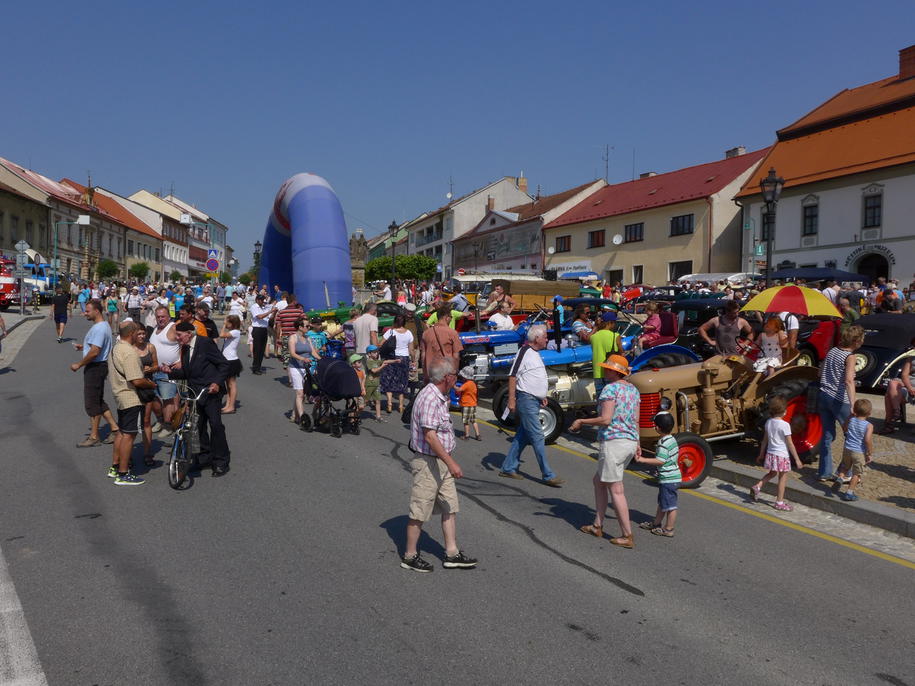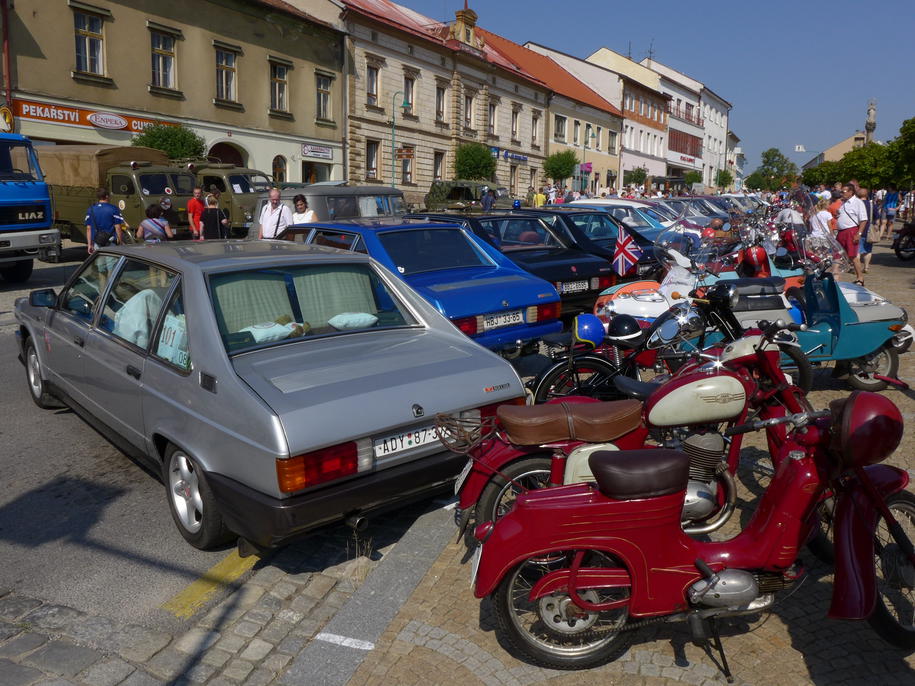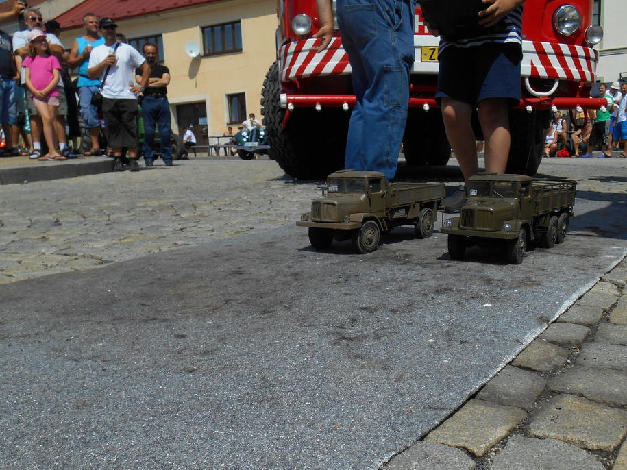 Osvědčené rozmístění vozidel podle stáří, značky a kategorie se oproti minulým ročníkům nezměnilo. Když to vezmu od kostela směrem vzhůru – traktory mazácky parkovaly částečně na chodníku. Nájezd na obrubník nepředstavoval pro zemědělské stroje žádný problém. Byl tu i "Mates" hasičák – a to nejen staticky na výstavě, nýbrž také pravidelně projížděl náměstí a kropením osvěžoval vzduch. Vzpomněl jsem si na Jirku a ze zvyku jsem si prohlédl přední poháněné Trilexy ;) . Vedle Matesa stála jasně červená kačenka, Tatra 138 NT 4x4, návěsový tahač LIAZ novějšího provedení s odpružením zadní nápravy vzduchovými vaky původem z Divadla na Vinohradech a dále vojenské automobily.
