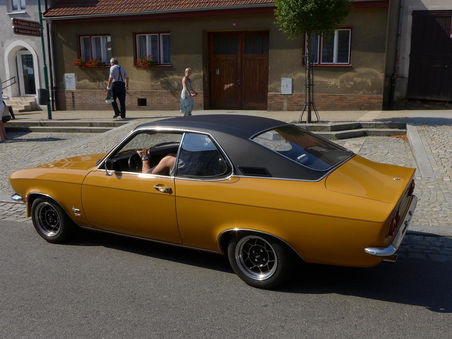 Opel Manta se stylově oblečenou posádkou – úplně jak z filmu Manta, Manta. Jen ta roztoužená kadeřnice jim chyběla :) .