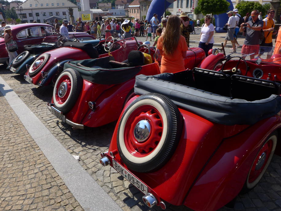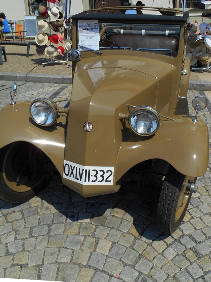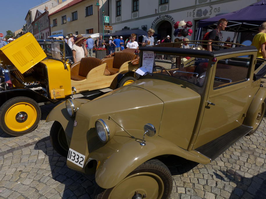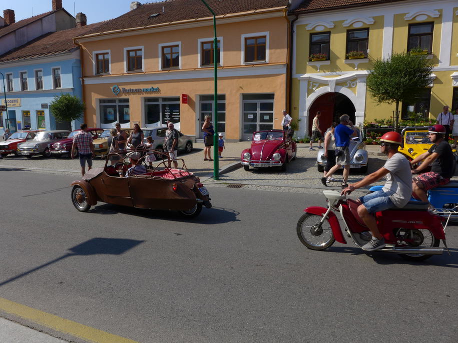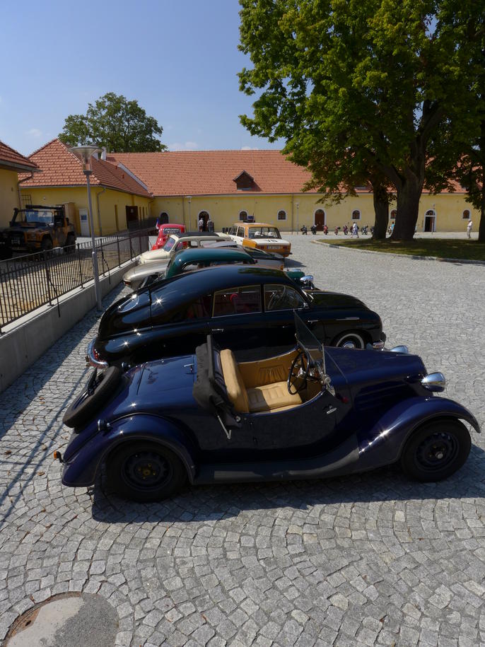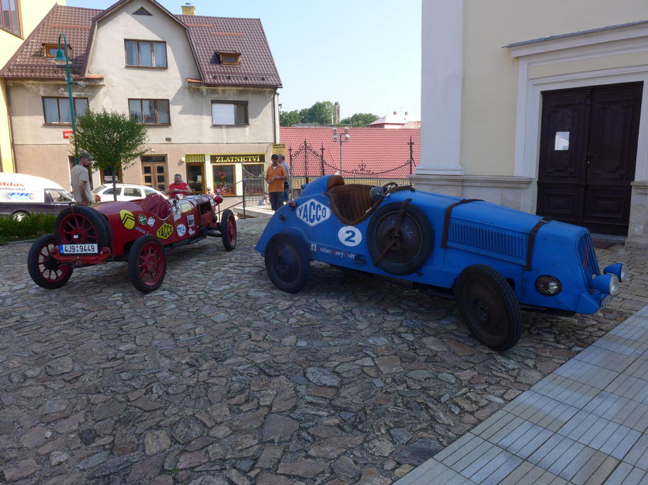 Ve stínu před kostelem mě zaujaly "historické" závoďáky. Chvilku jsem v tom hledal jakousi historii, ale podivné zavěšení všech kol a kolébavý pohyb vozů mě z toho vyléčil. Spíš by se slušelo označit je slovem historizující, neboť se jedná o přestavbu známé kachny.