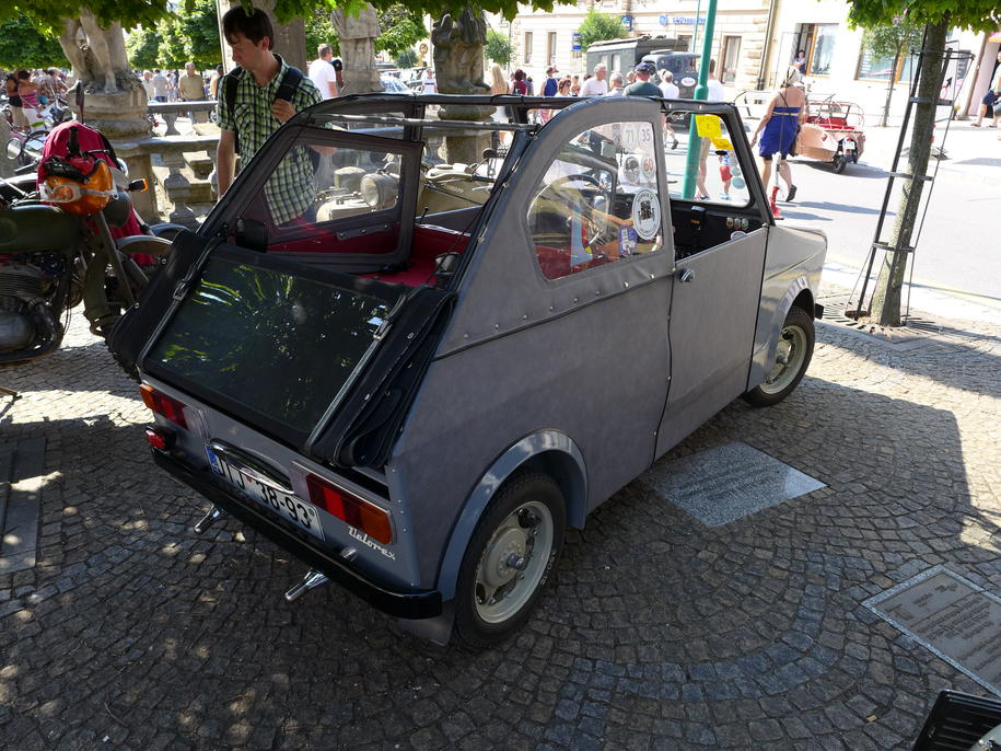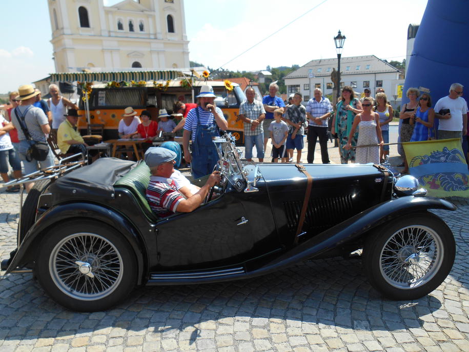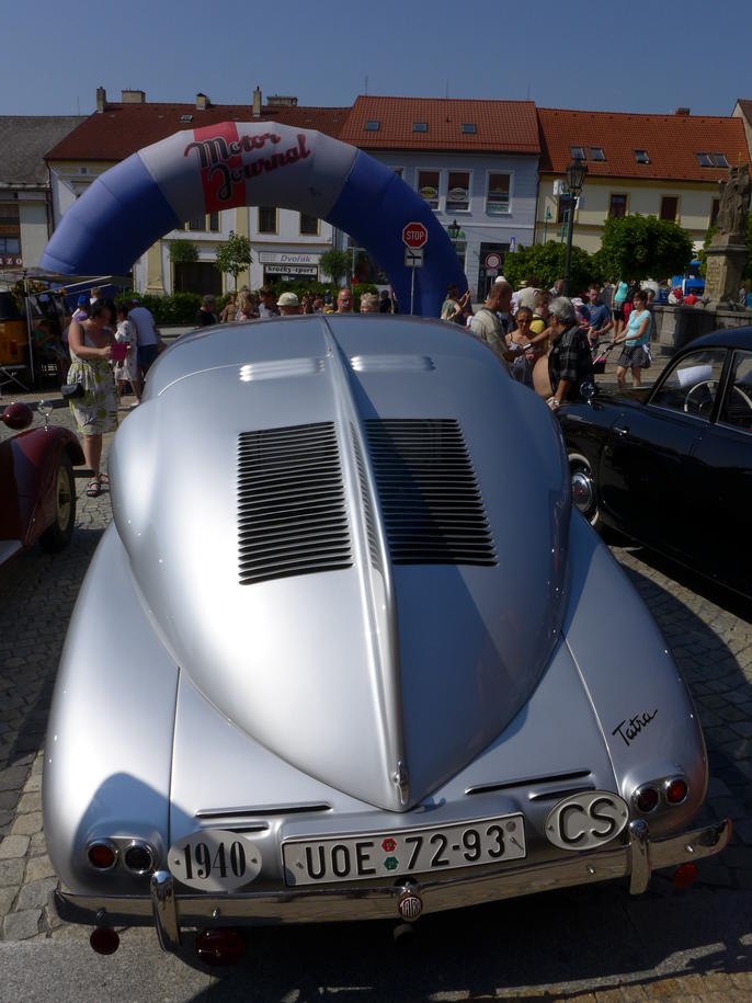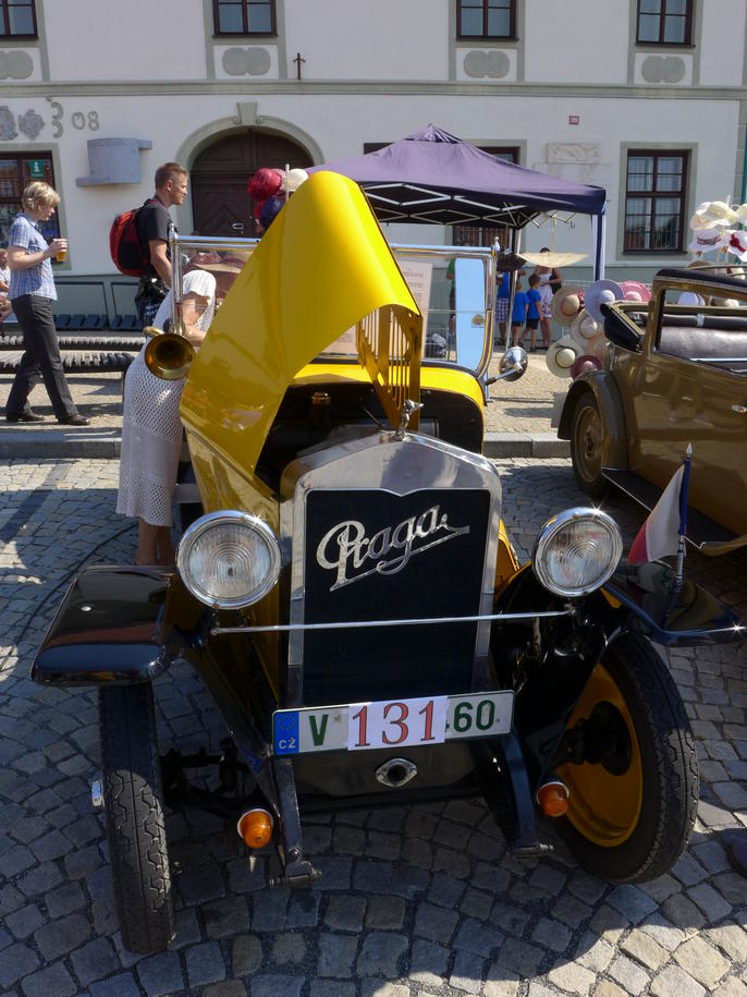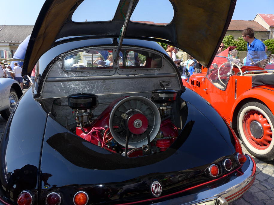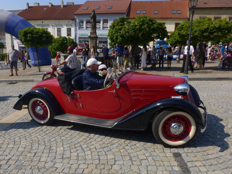 Ve stínu před kostelem mě zaujaly "historické" závoďáky. Chvilku jsem v tom hledal jakousi historii, ale podivné zavěšení všech kol a kolébavý pohyb vozů mě z toho vyléčil. Spíš by se slušelo označit je slovem historizující, neboť se jedná o přestavbu známé kachny.