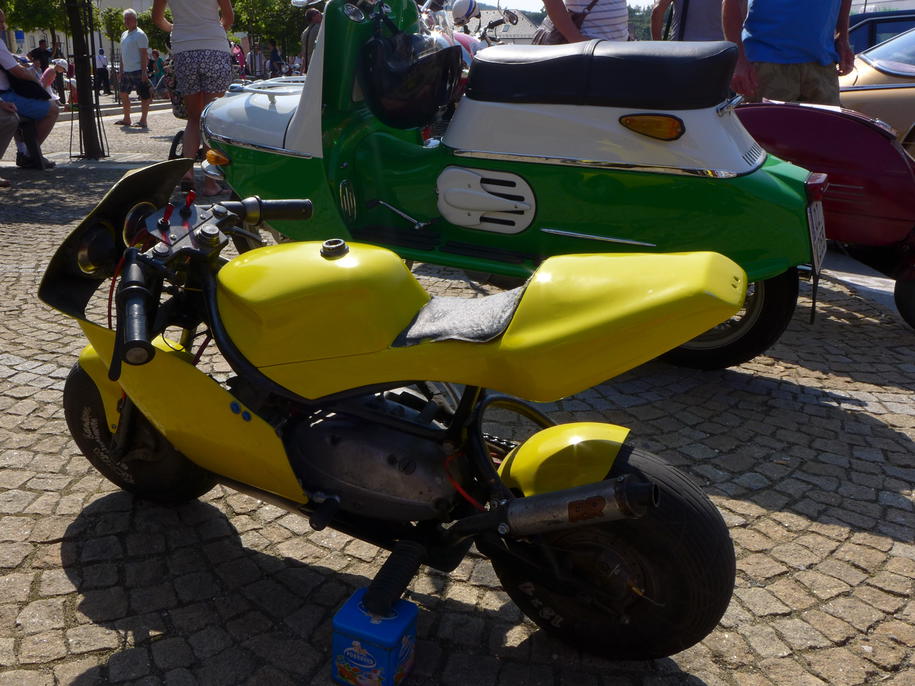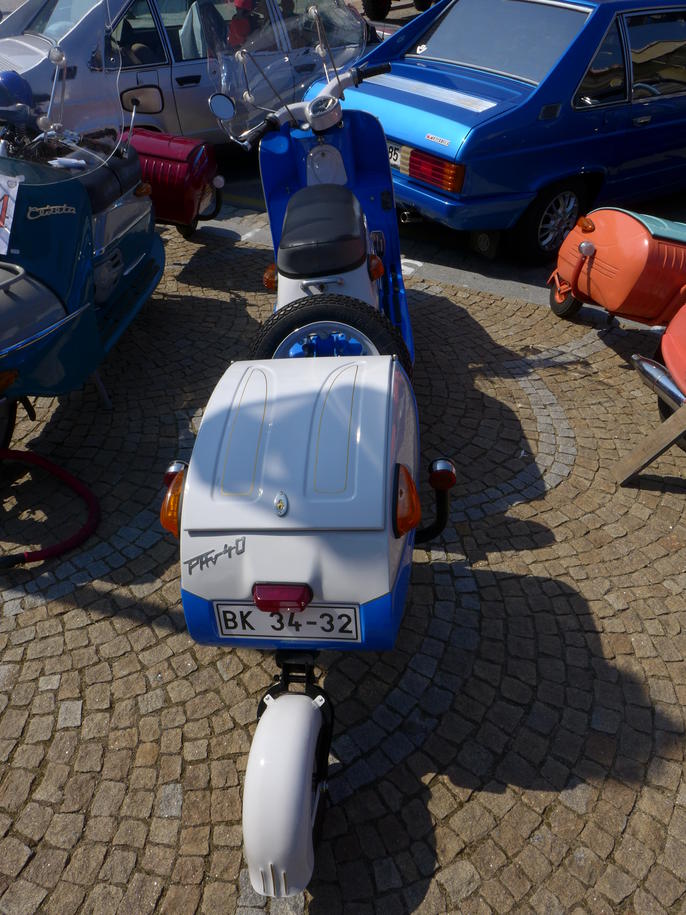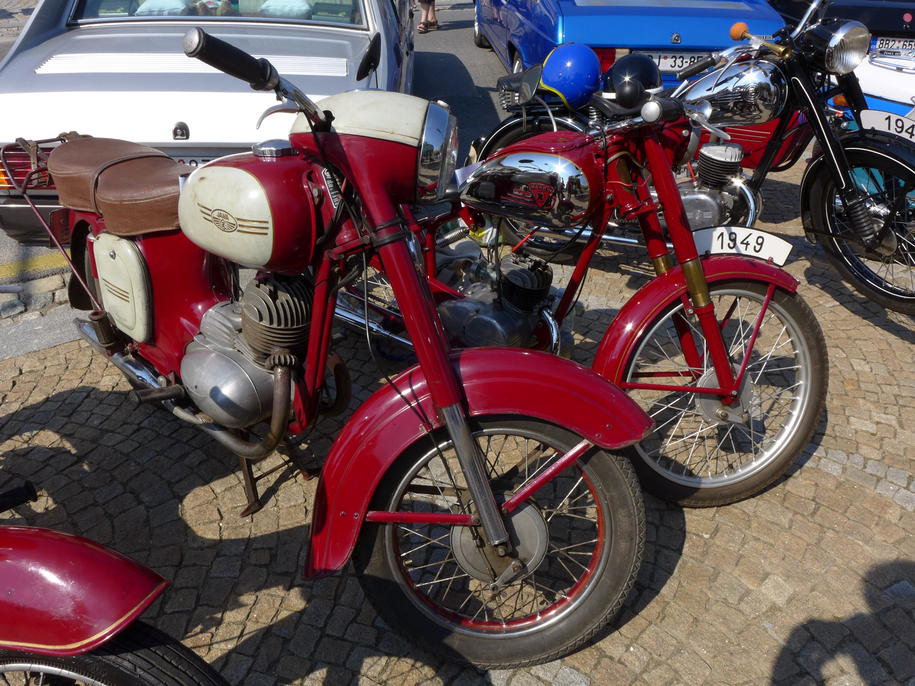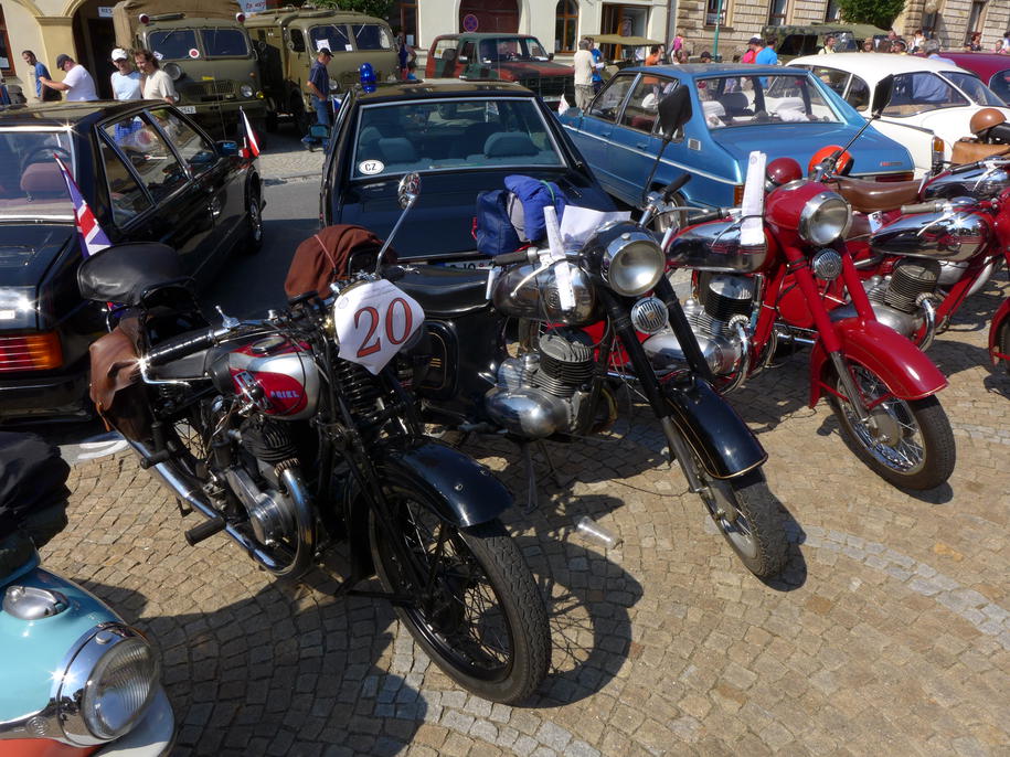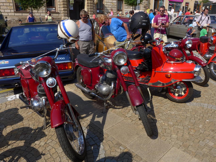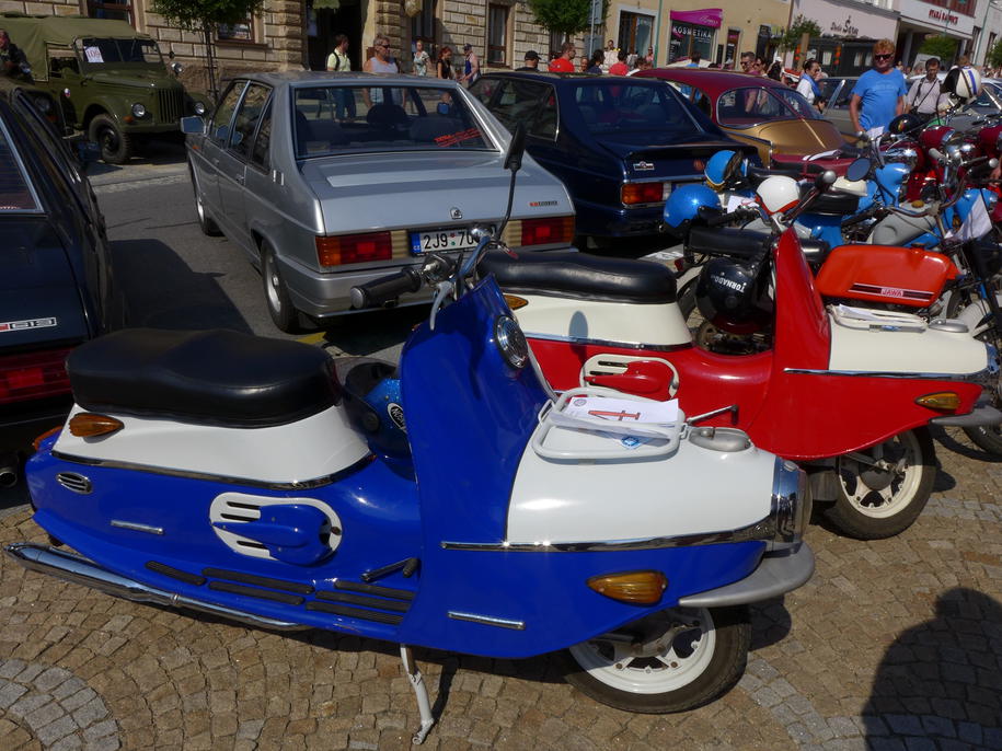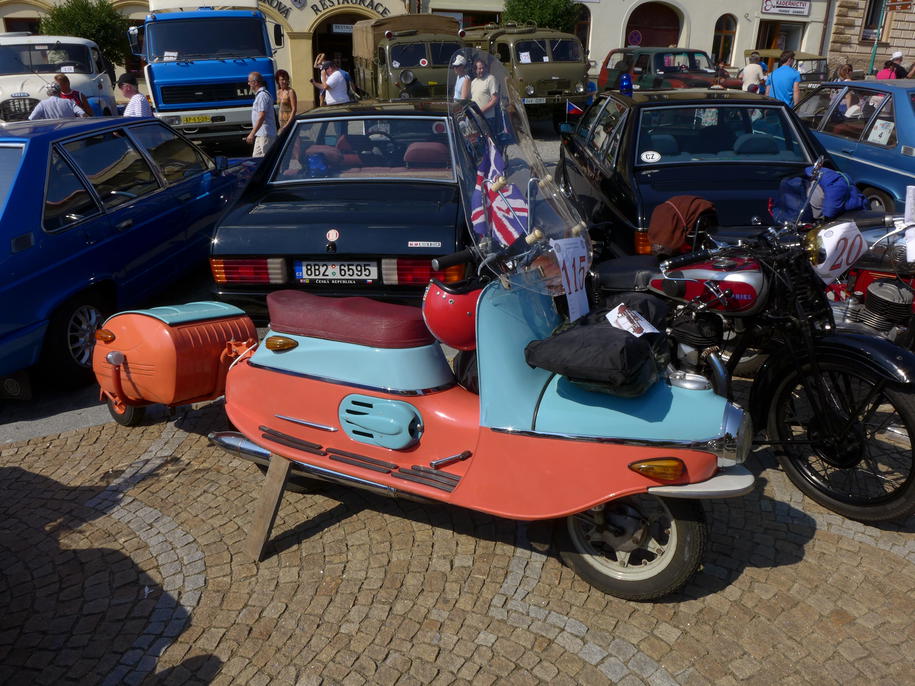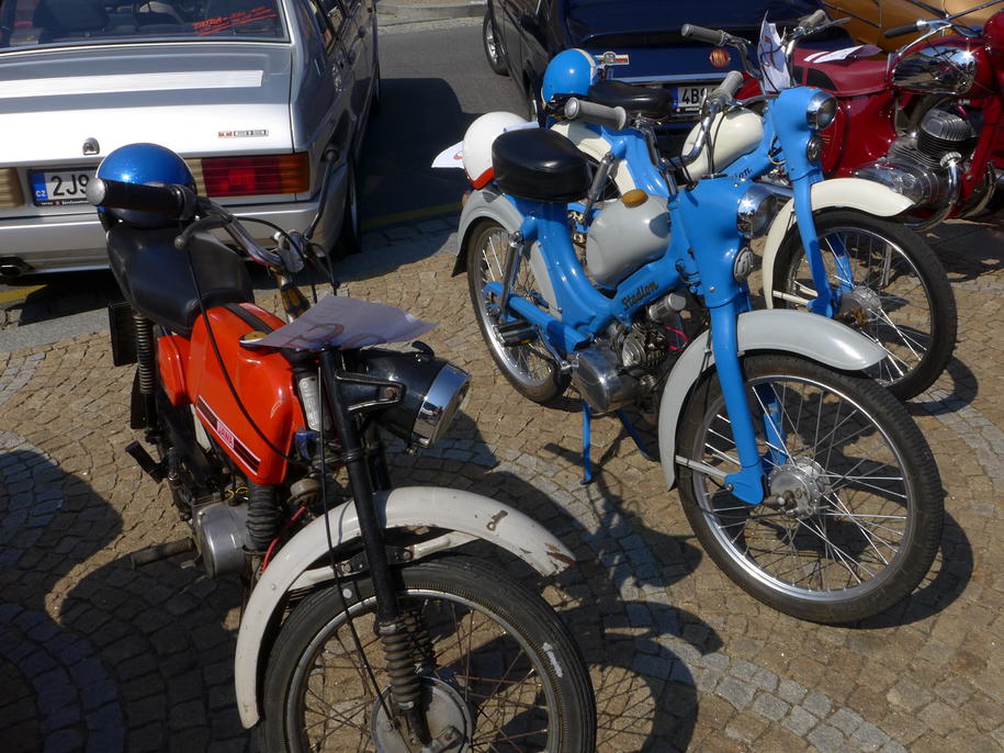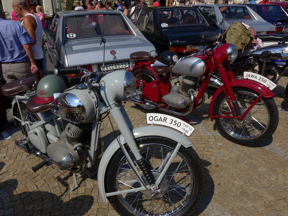 Za nimi, ve stínu mladých kaštanů, se schovávaly Velorexy obklopeny motocykly především domácí produkce. Jawy, skůtry, Stadiony, ale také BSA, OGAR, Norton a dokonce jedna mikromašina.