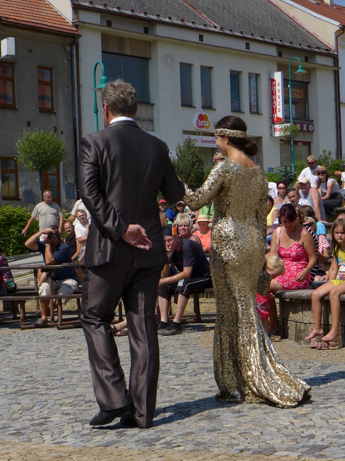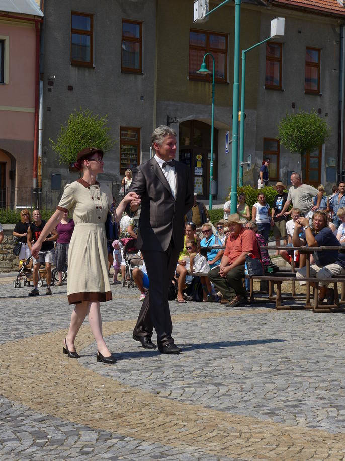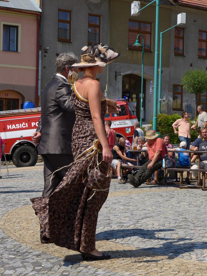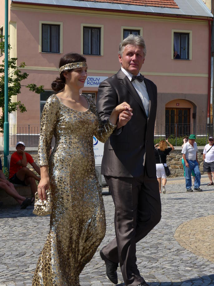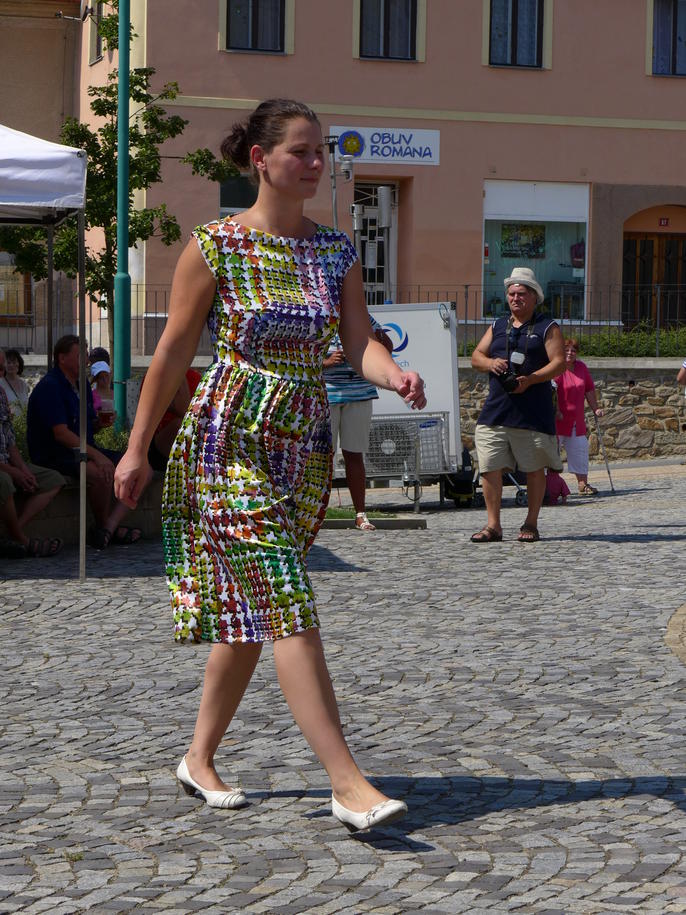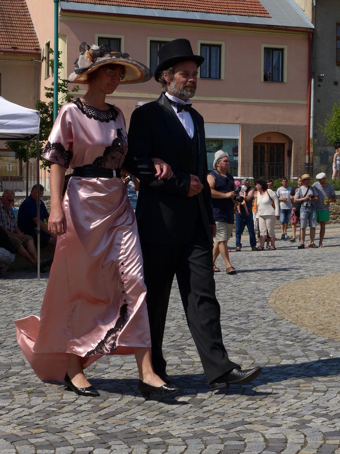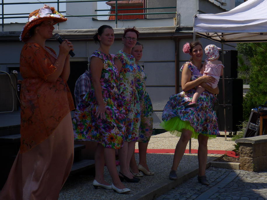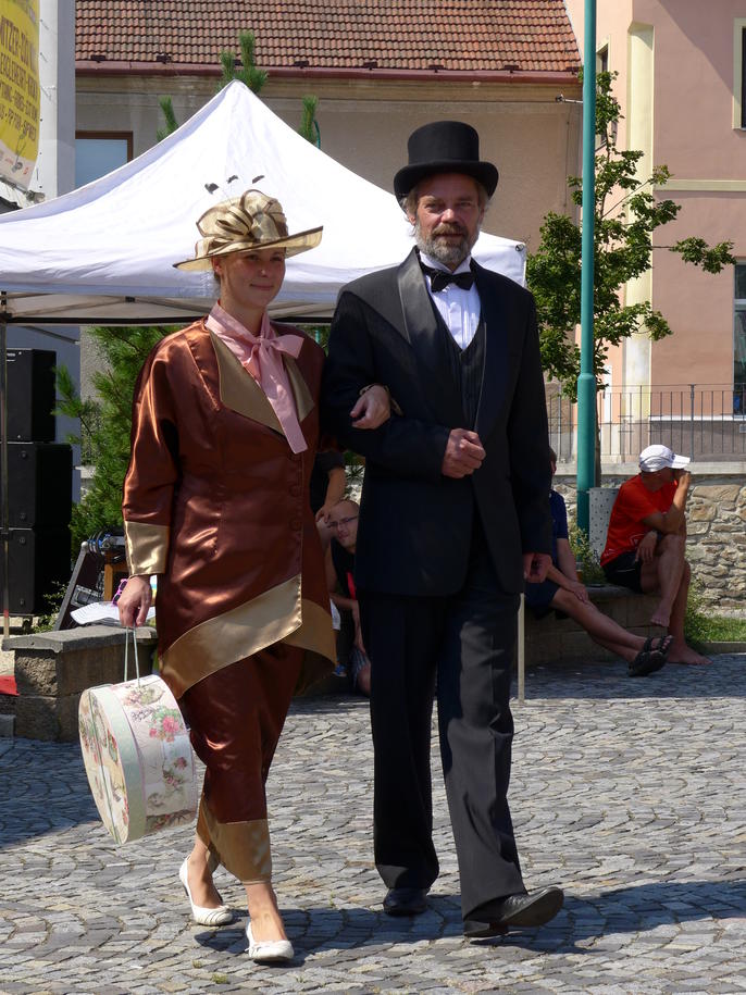 Doprovodná kapela hrála letos v amfiteátru ve spodní části náměstí. To se ukázalo jako výborný nápad, zejména při následné dobové módní přehlídce. Jednak se trochu zvětšil prostor pro auta na náměstí, jednak mohli diváci sedět a v klidu sledovat představení. Na módní přehlídku se nám podařilo alokovat strategicky vynikající pozici. Seděli jsme schovaní pod keřem ve spodním rohu hlediště, takže jsme měli modely krásně nasvícené. Přestože šlo o přehlídku oděvů z 20. století, začala rokem 1850 následovaným rokem 1897. Následně se paní Baxantová zeptala Františka, jestli mu ty roky něco říkají. Ten samozřejmě bez rozmyslu ihned odpověděl, že rok 1850 znamená založení firmy Tatra panem Ignácem Šustalou (tehdy jako továrny na výrobu kočárů a bryček) a rok 1897 je rokem vzniku prvního automobilu v Kopřivnici – Präsident.