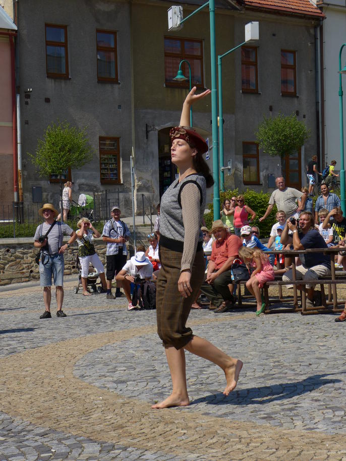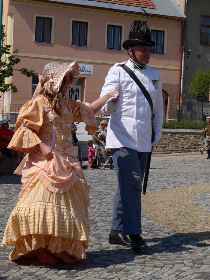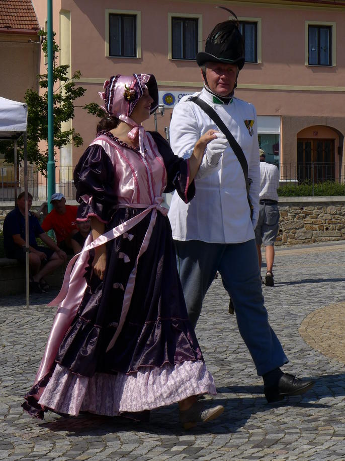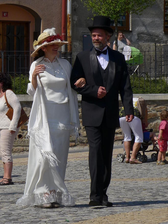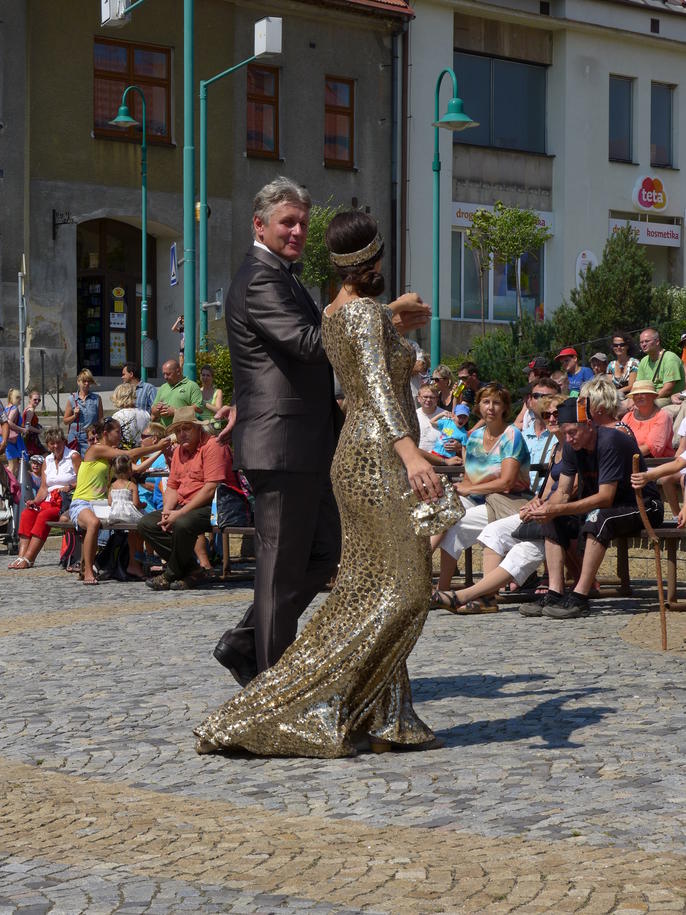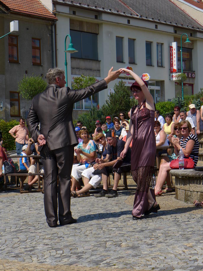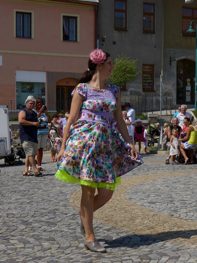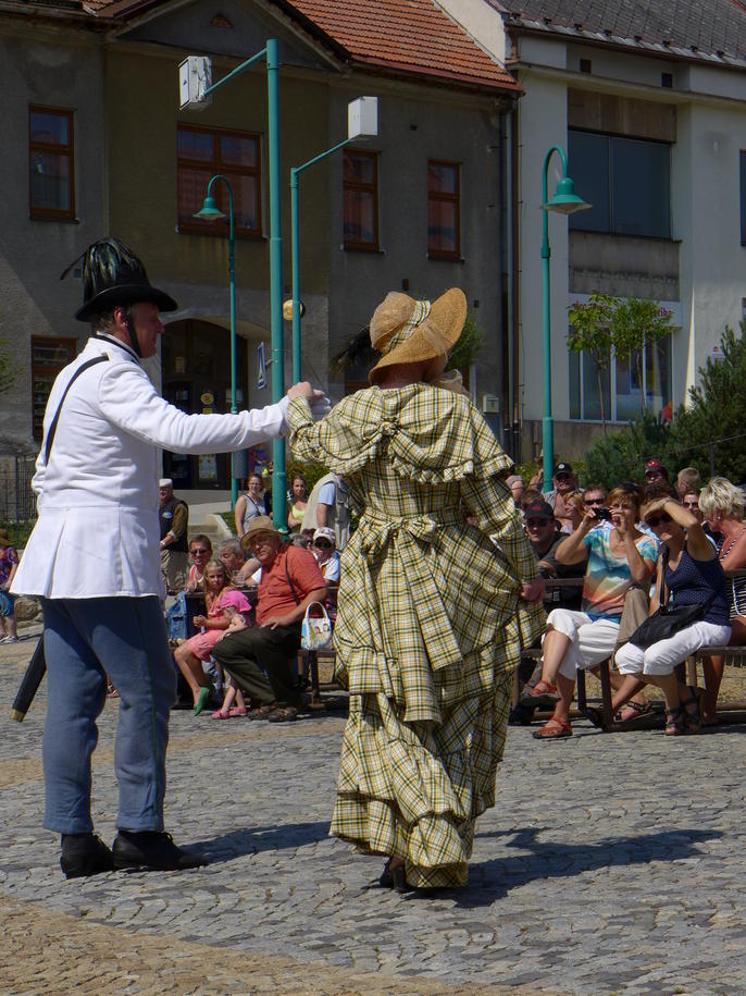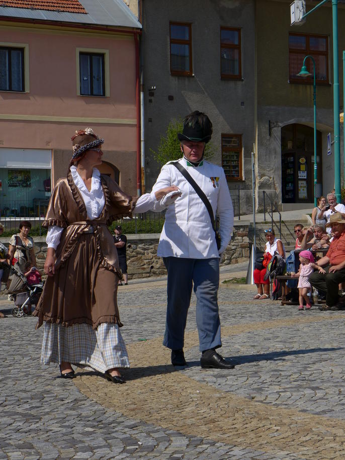 Doprovodná kapela hrála letos v amfiteátru ve spodní části náměstí. To se ukázalo jako výborný nápad, zejména při následné dobové módní přehlídce. Jednak se trochu zvětšil prostor pro auta na náměstí, jednak mohli diváci sedět a v klidu sledovat představení. Na módní přehlídku se nám podařilo alokovat strategicky vynikající pozici. Seděli jsme schovaní pod keřem ve spodním rohu hlediště, takže jsme měli modely krásně nasvícené. Přestože šlo o přehlídku oděvů z 20. století, začala rokem 1850 následovaným rokem 1897. Následně se paní Baxantová zeptala Františka, jestli mu ty roky něco říkají. Ten samozřejmě bez rozmyslu ihned odpověděl, že rok 1850 znamená založení firmy Tatra panem Ignácem Šustalou (tehdy jako továrny na výrobu kočárů a bryček) a rok 1897 je rokem vzniku prvního automobilu v Kopřivnici – Präsident.
