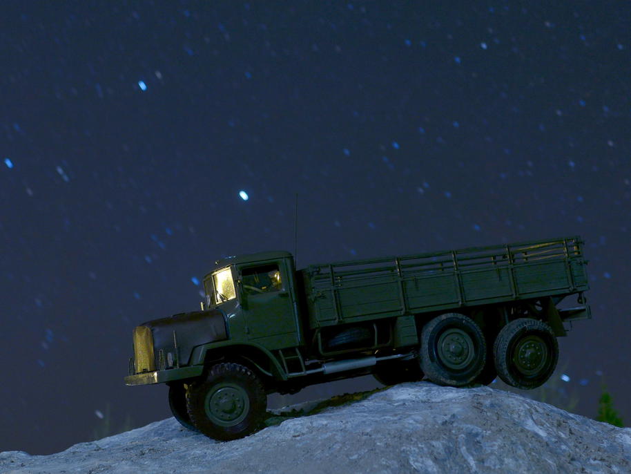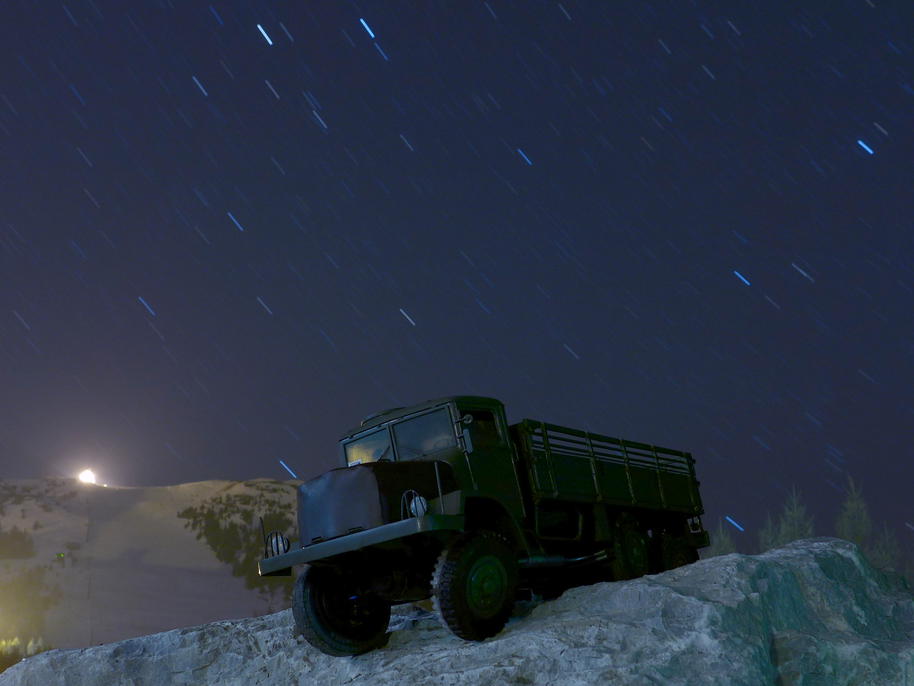 Ze soboty na neděli byla navíc krásná jasná noc. Na této fotce se podařilo zachytit zajímavou kombinaci různých zdrojů světla. Světla hotelového pokoje zvýraznila Tatru v popředí, v pozadí se mísí kombinace světel projíždějících aut a pouličního osvětlení a na horizontu pak zcela tmavá silueta horských vrcholků a namodralá noční obloha s hvězdami.
