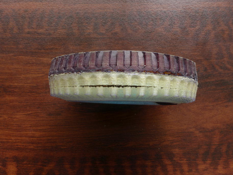 Co se týká vyhodnocení posledních testů – takto dopadla první prototypová pneumatika po náročných testech v Chorvatsku – definitivně se roztrhla nejen v nedokonalém sváru, ale také v místě, kde nebyla tisková vrstva dokonale položena. Je to dobře patrné na výtisku samotném, bylo to jen otázkou času.