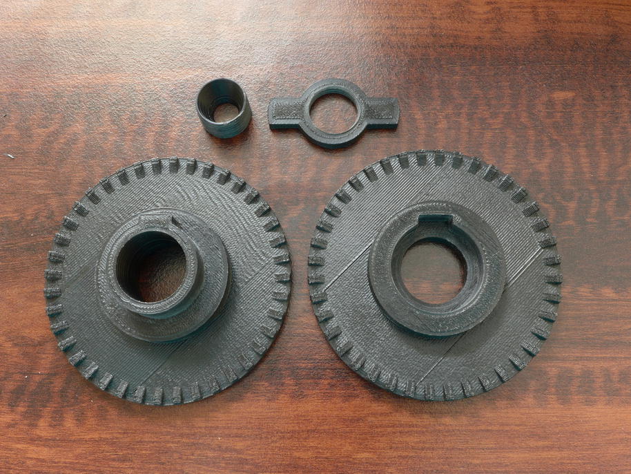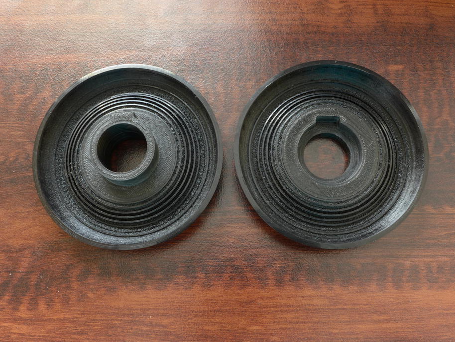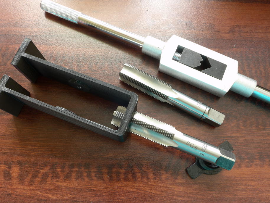 Další důležitou, ale dosud ne zcela vyzkoušenou součástí úspěšné realizace, byl co nejlepší postup svařování. Nemělo smysl svařování uspěchat, zvlášť když tisk jedné poloviny pneumatiky trvá 16 hodin (s 80% úspěšností). Věnoval jsem tedy čas a úsilí vývoji a výrobě svařovací stolice, jejíž prototypové díly si můžete prohlédnout na následujících fotkách. Závit samozřejmě nemá smysl v hrubé kvalitě tisknout, závitník svou práci odvede výrazně lépe a rychleji, než 3D tiskárna.