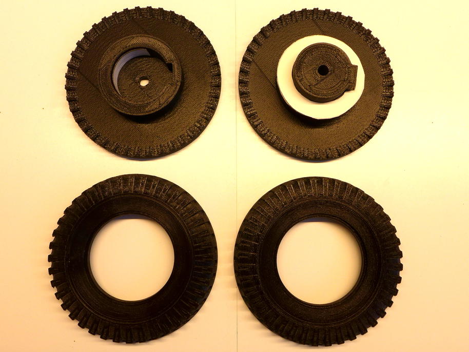 Všechny zkušenosti nabyté při testech jsem pečlivě zohlednil při návrhu a realizaci finálních pneumatik. Základem je kvalitní materiál. Zde bych rád opět vyzdvihl výborné chování tiskového materiálu Flexfill 92A , vyráběného českou firmou Fillamentum . Dále je potřeba pomalý a přesný 3D tisk při správné teplotě. Vrstvičky musí být bezvadně slité, povrch lesklý, nespálený.