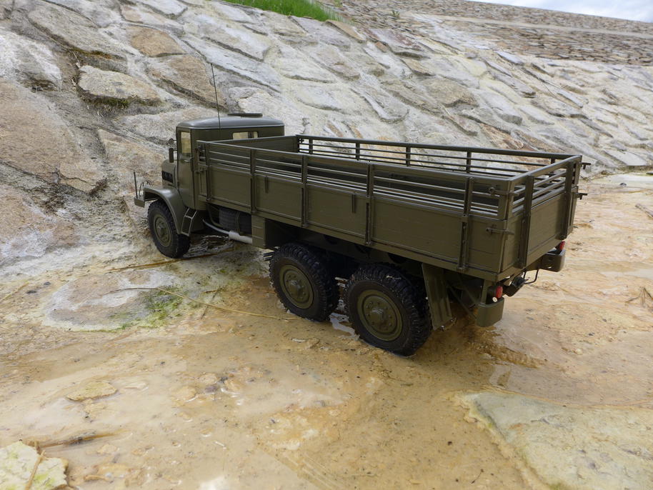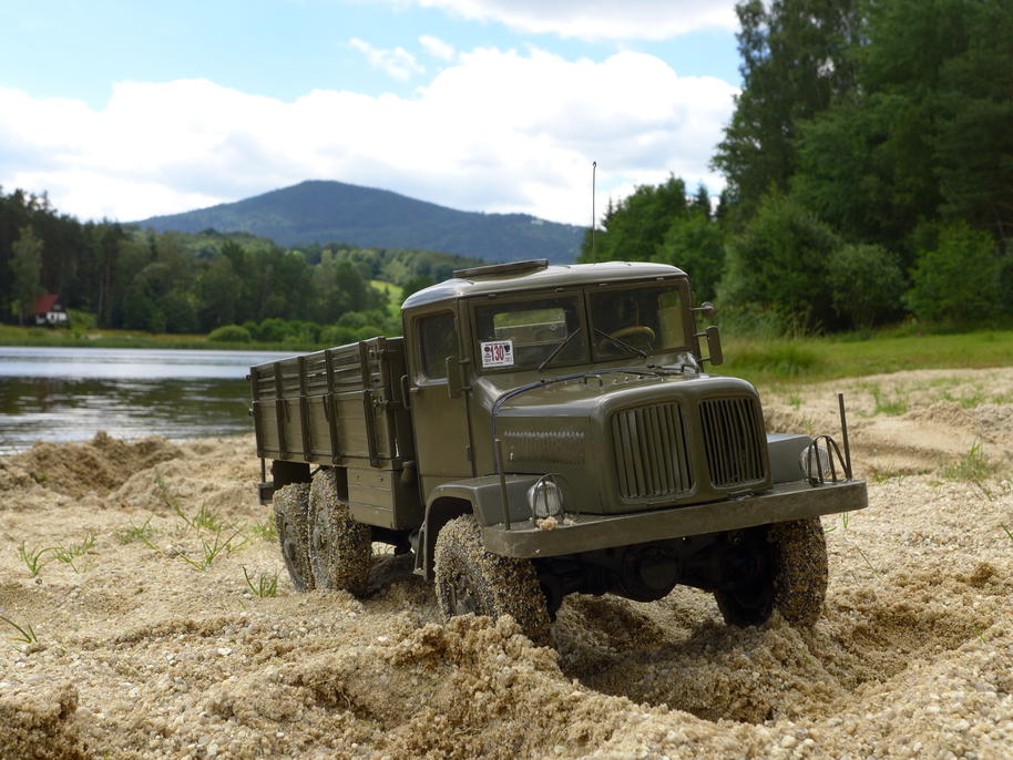 A ještě jedna zajímavost – hned poté následuje dlouhý průjezd po písčité pláži, kde je dobře vidět, kolik času a prostoru potřebuje Tatra k postupnému rozjezdu na pátý rychlostní stupeň. Rozjezd je z dvojky, a celý úsek jede zařazenou redukcí (ano vím, že skutečná převodovka T128 měla půlky a ne redukce, ale model má dvoustupňovou mechanickou převodovku, kterou používáme jako redukci).