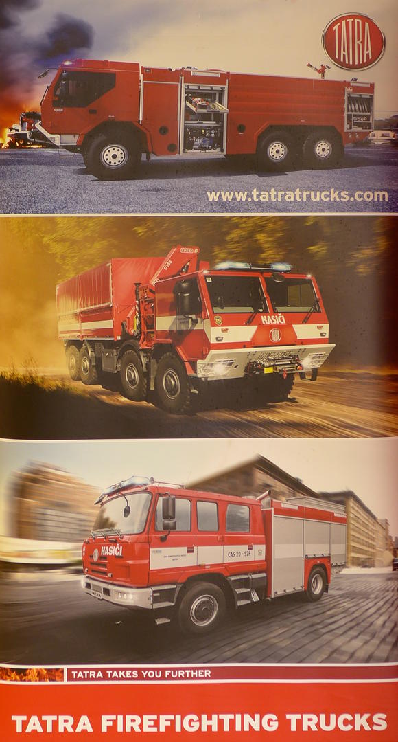 Improvizovaný firemní stánek Tatry byl hned u vstupu do expozice. Byl tu stolek s velkým reklamním poutačem s obrázky hasičských Tater. Na stánku byly k dispozici reklamní předměty a propagační materiály. Stánek byl trvale v obležení zvědavých návštěvníků. Kupovalo se úplně vše – od malých reklamních předmětů, přes oblečení s obrázky Tater až po plastové hračky. Dokonce jsem zahlédl i malého plastového Phoenixe :) . Je dobře, že se Tatra aktivně snaží vracet do povědomí lidí.