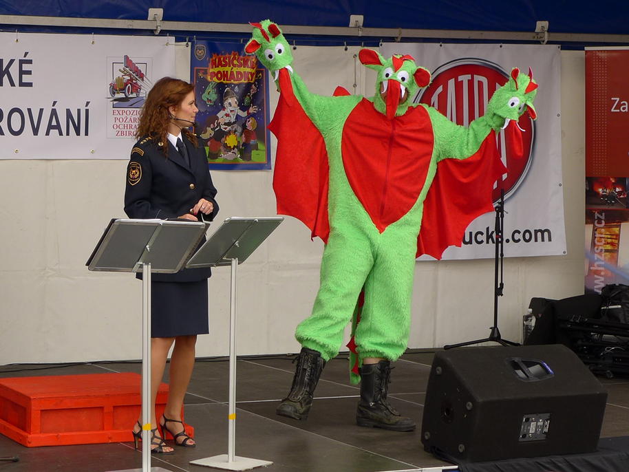 Po úvodním proslovu a vyhodnocení fotografické soutěže došlo na křest knížky Hasičských pohádek. Jak pravila paní mluvčí, v knížce je osm draků a jeden z nich – tříhlavý zelený dráček Ohniváček – vyletěl přímo z knížky Hasičských pohádek, aby se osobně všemi třemi páry svých očí podíval na její křest ;) .