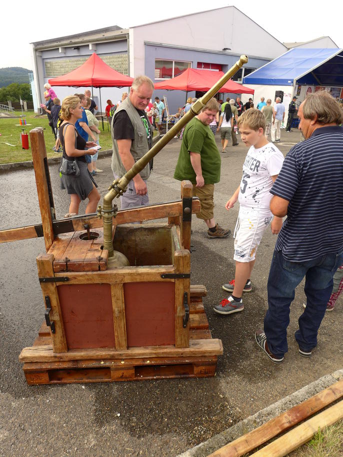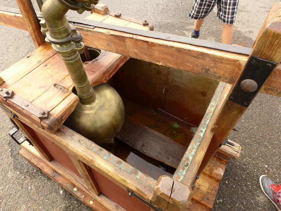 Pak již následovala prezentace historických stříkaček. Jako první představili hasiči stříkačku smykovou (táhne se po smyku). Hašení malého ohníčku by jistě s pomocí tohoto historického kousku bylo úspěšné, ohníček ale bylo nutné zachovat i pro předvedení druhé stříkačky. Přesto přesun kastrolu s ohníčkem během zásahu jedním z hasičů působil spíš jako záškodnická akce než jako součást představení :) .