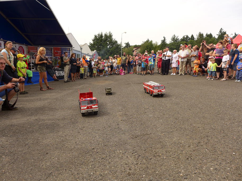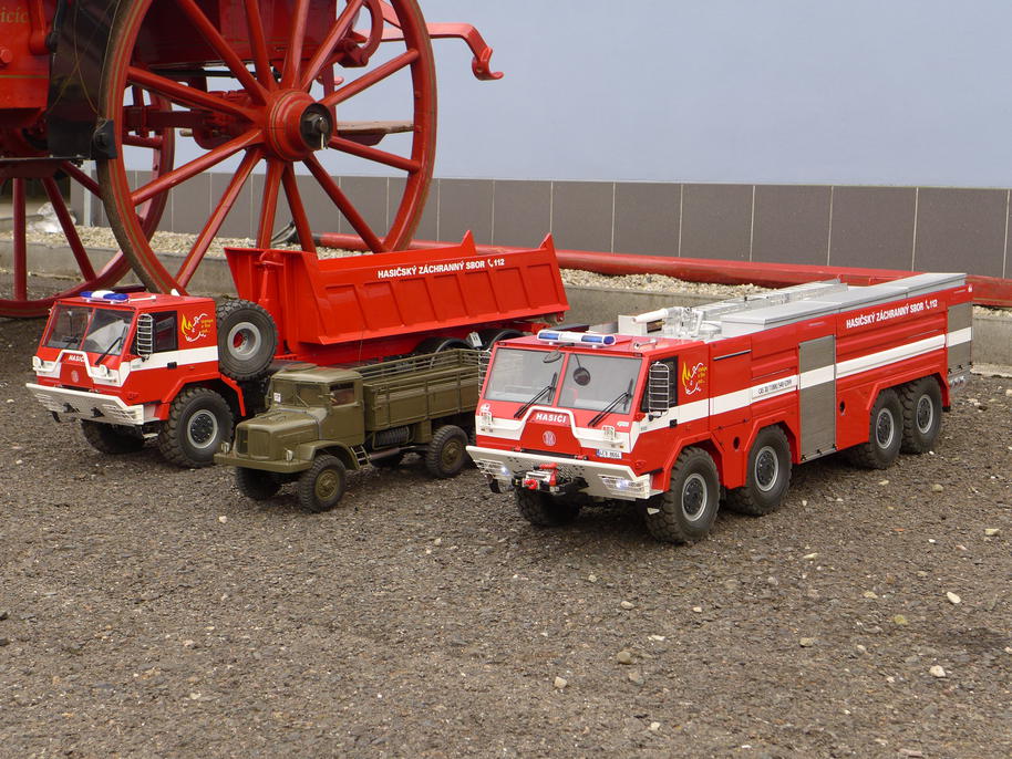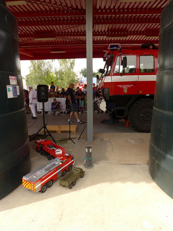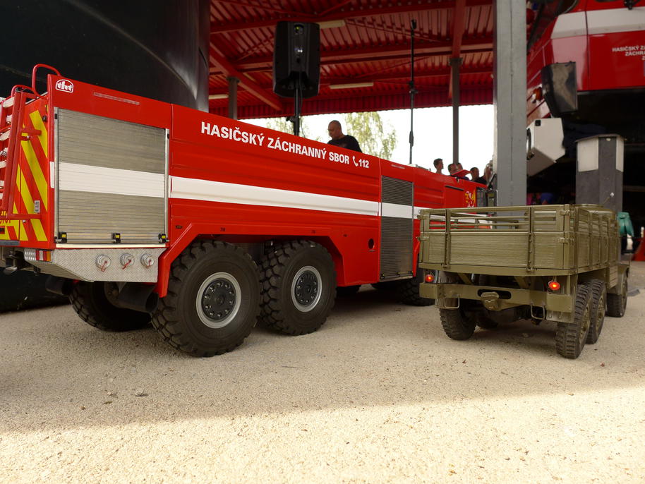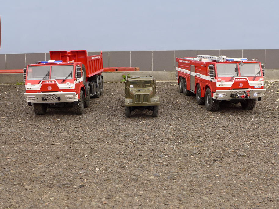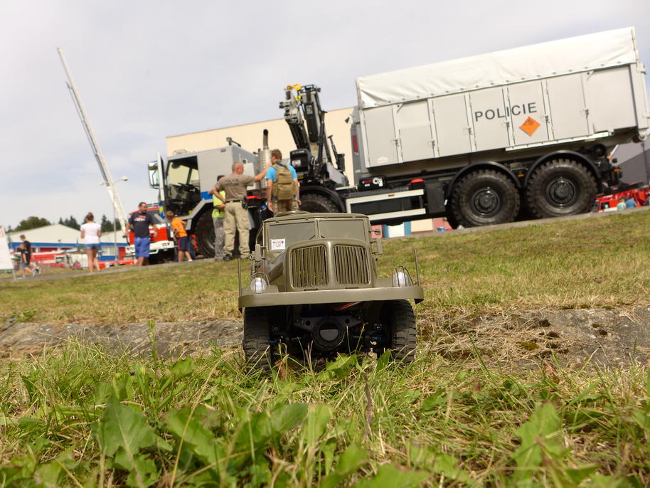 Těsně poté dostaly krátký prostor před pódiem naše RC modely. Jinak jsme se pohybovali po areálu mezi návštěvníky. Společnost Tatře 130 dělaly dvě nablýskané osmikolky T815-7 v měřítku 1:10 a v barvách HZS.