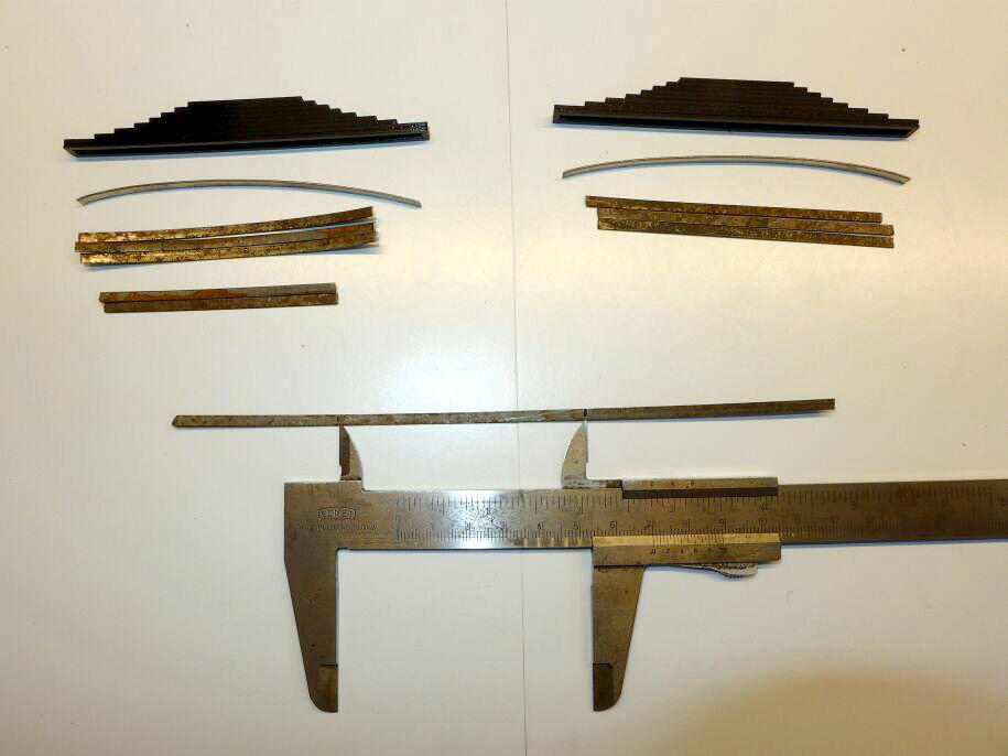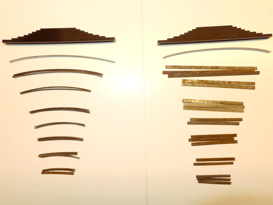 Teď už asi tušíte, jak by to mohlo souviset s modelovými listovými pery, jak jsem již před časem naznačil ve svých reportážích. Pružinové pásky ze štětin zametacích vozů mají šířku od 3 do 4mm a délku podle toho, jak se pásek při zametání odlomil. Poskládám-li patřičné množství pásků na sebe přesně podle skutečného listového pera, dostanu plně funkční pero modelové.