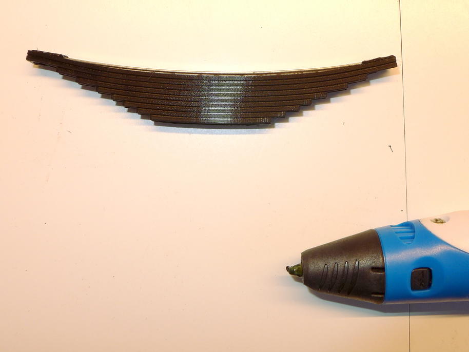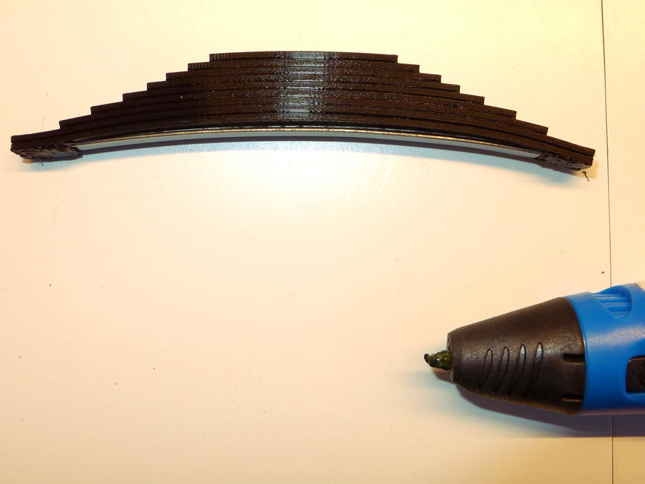 Jen ten vzhled pružnových pásků není úplně maketový. Jsou výrazně tenčí, než by odpovídalo listům pera podle skutečnosti. Ale naštěstí tu je 3D tiskárna a pružný materiál Flexfill od české firmy Fillamentum – vnější pohledovou část tedy mohu vytisknout. Z úplně prvních testů pneumatiky mi tu zbyla role tvrdšího Flexfillu 98A , z nějž vyrobím obal na pružinové pásky. Základem je samozřejmě 3D model, ale jeho příprava je vcelku triviální operací – opět jde pouze o to, jak přesně se podaří naměřit a poté nakreslit vzhled pera. Na této fotce již 3D tiskárna tvoří jeden obal listového pera...