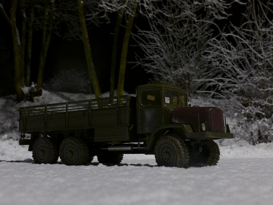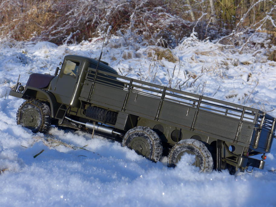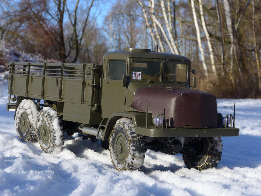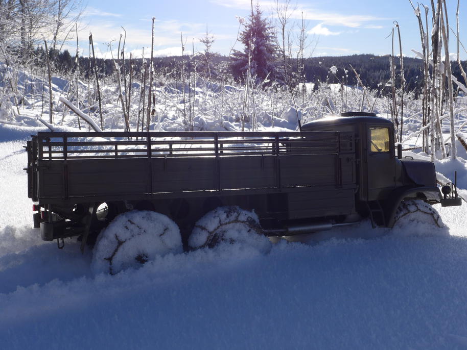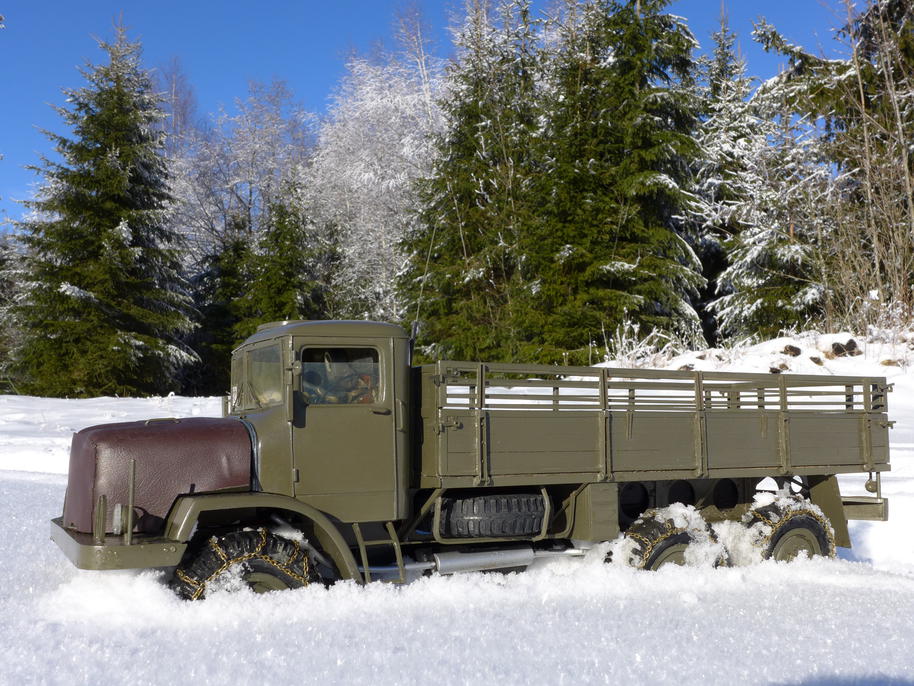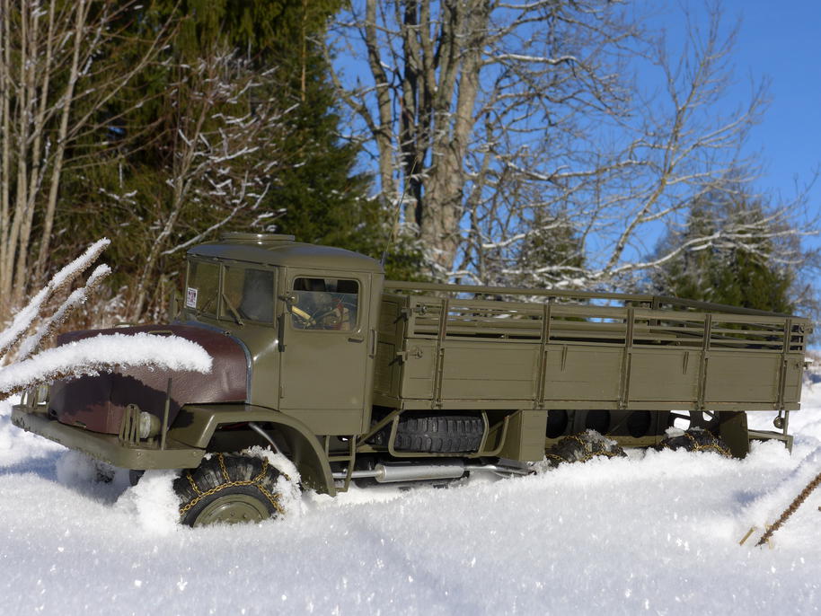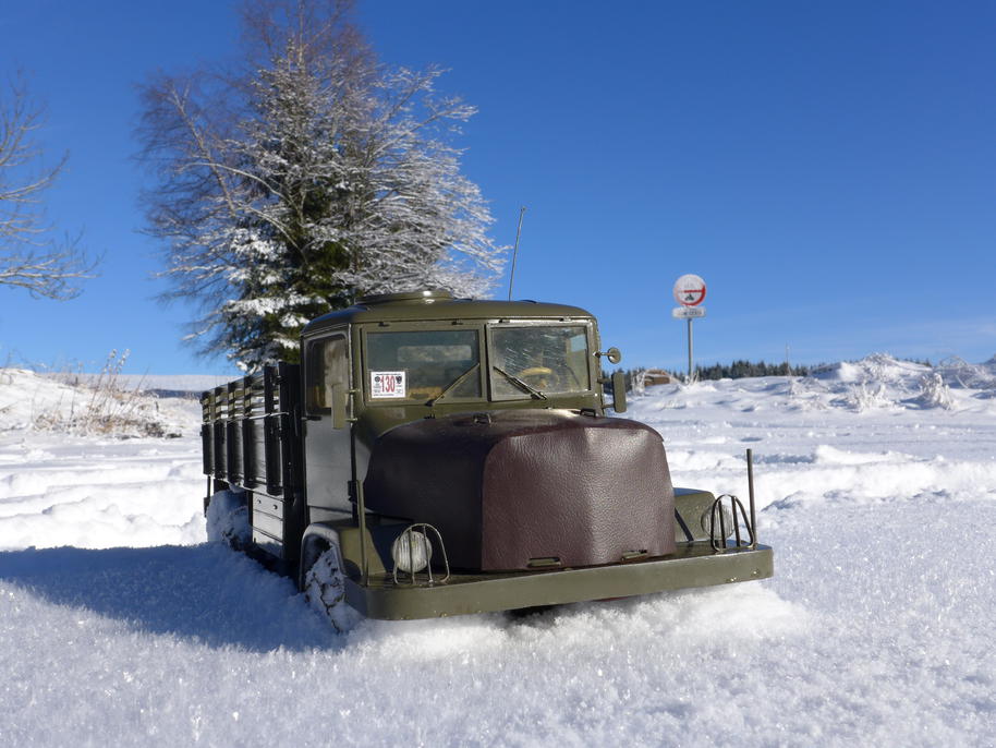 Původně jsem chtěl, aby Tatra trochu zapadala sněhem. Ten je ale zatím hodně mokrý – kabině to nevadí, ta je odolná, ale pro dřevěnou podlahu korby to dobré není.