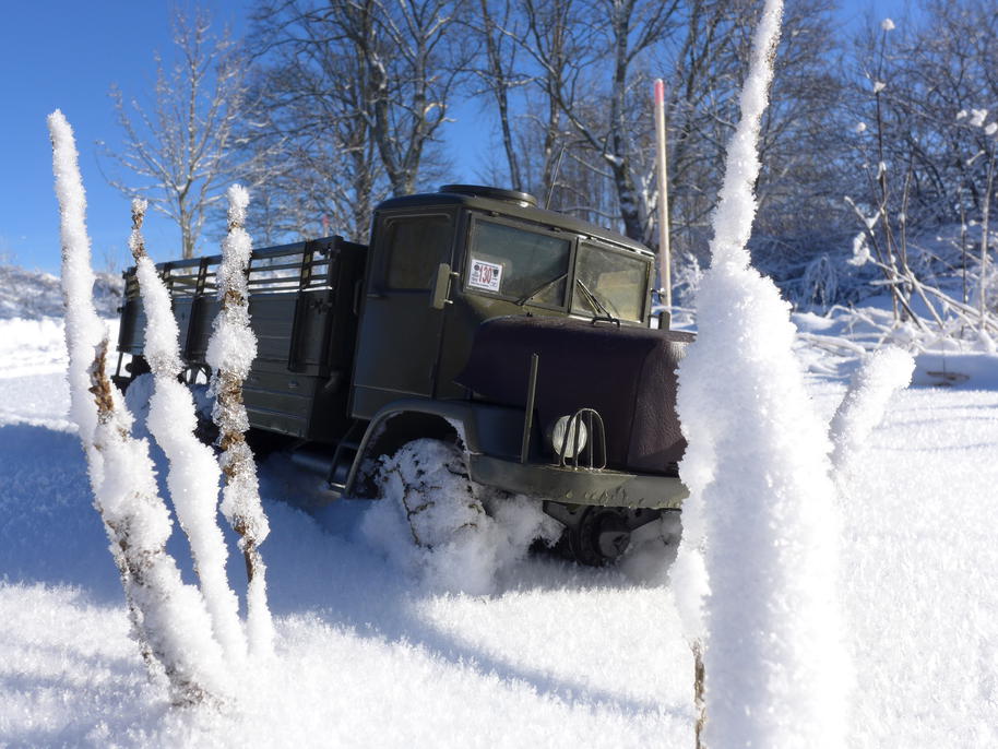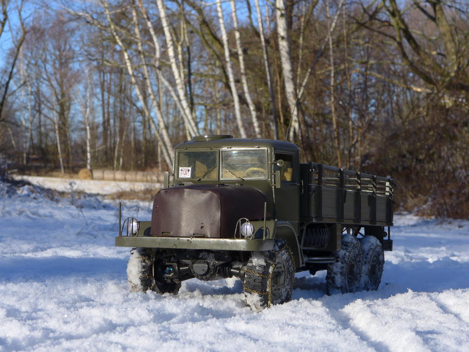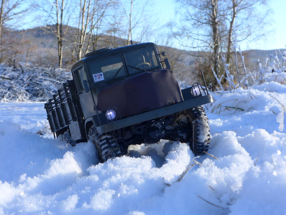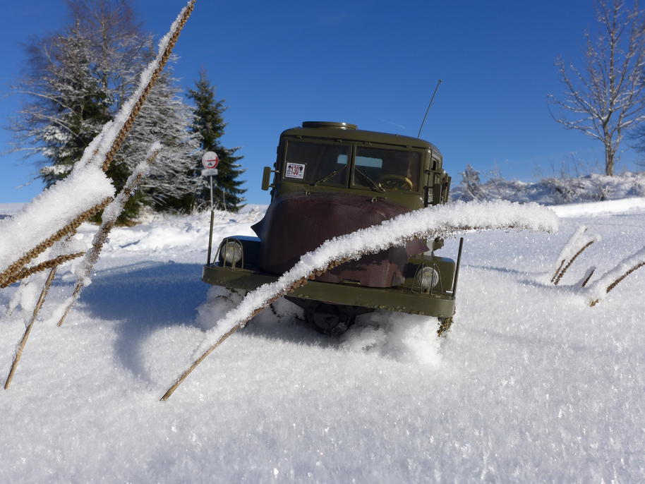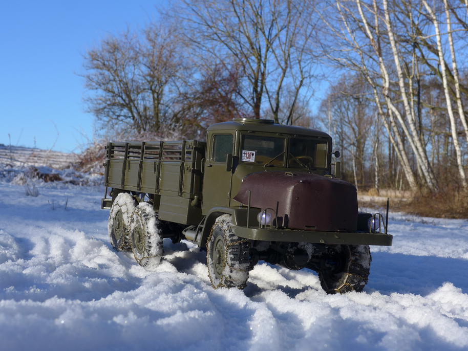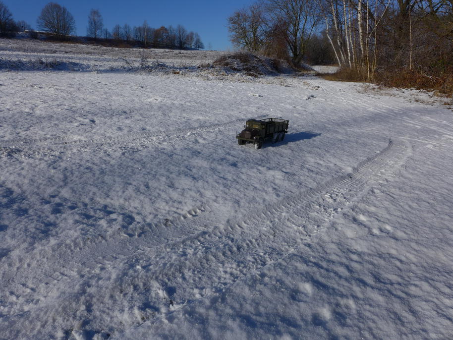 Druhý den ráno nás přivítalo slunečné a mrazivé počasí. Vyrazili jsme s Tatrou na malou expedici. Cílem bylo zjistit chování pneumatik s řetězy ve sněhu.