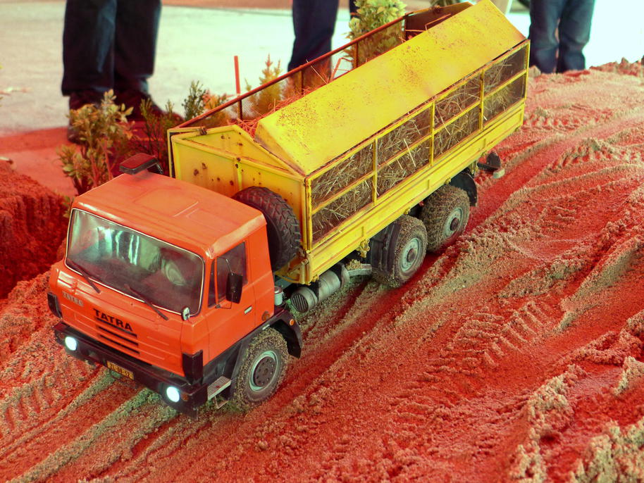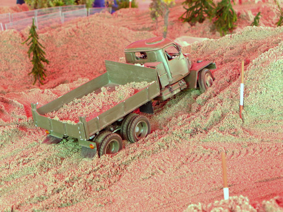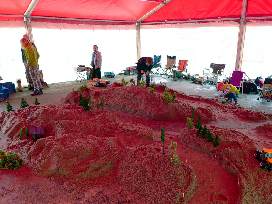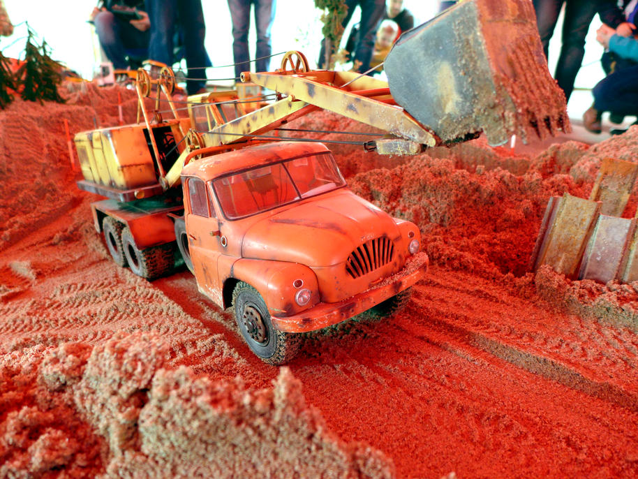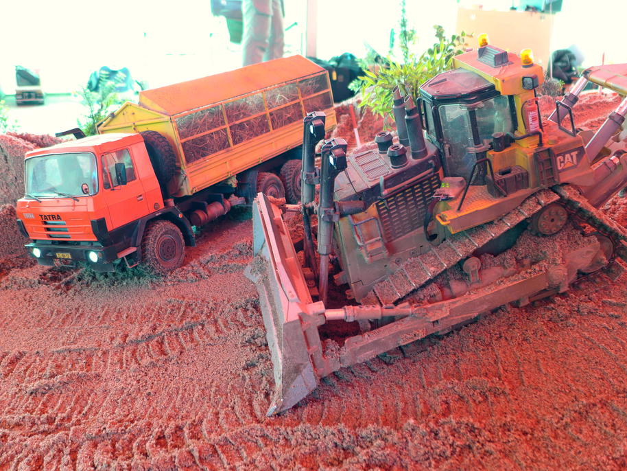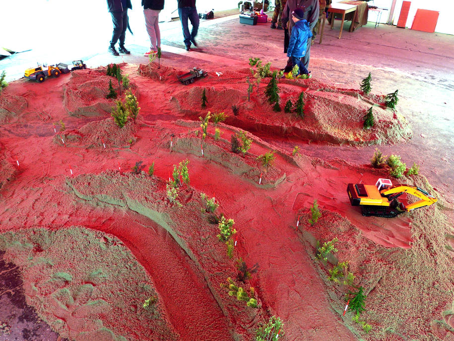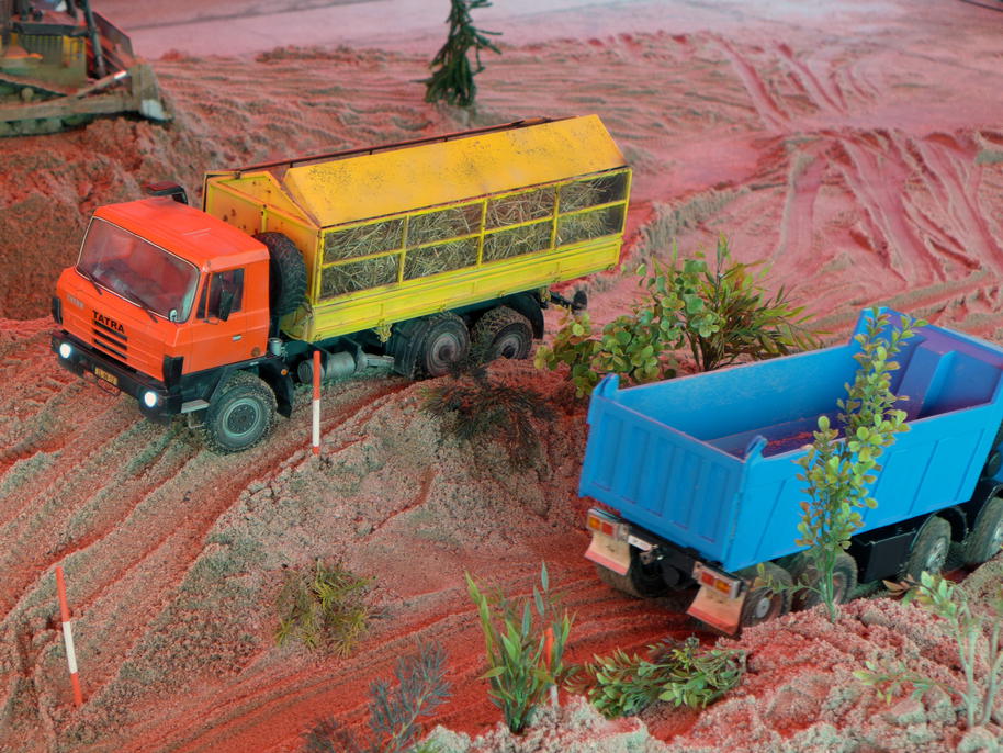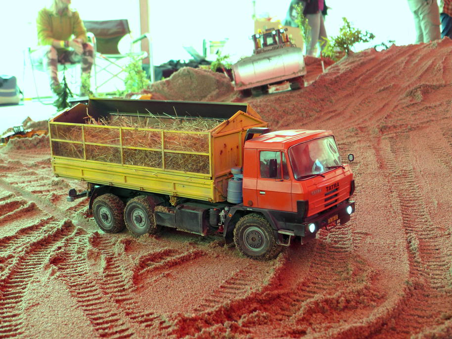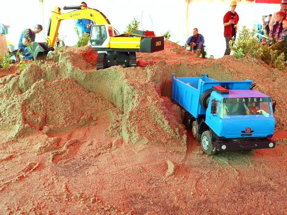 Měli jsme k dispozici mokrý písek, který vlivem vlhkého počasí (celou noc na neděli pršelo) zůstal sjízdný i v neděli. Navíc tentokrát jsme terén rozdělili na několik velkých hromad, mezi nimiž byly cesty tvořené přímo podkladovým asfaltem. To umožnilo v podstatě všem vozidlům pohyb v modelové krajině. Dokonce i návěsový tahač Volvo zvládal průjezd, pokud se jeho řidič obezřetně vyhýbal hromádkám písku ;) .