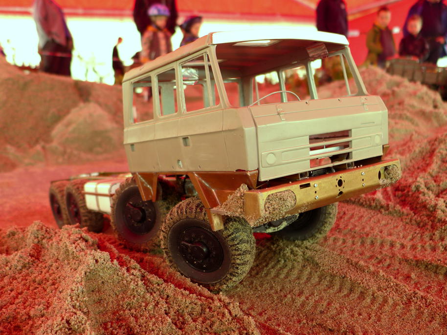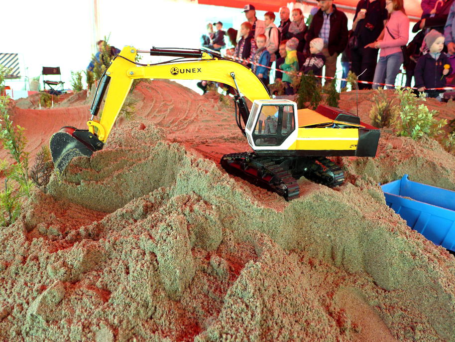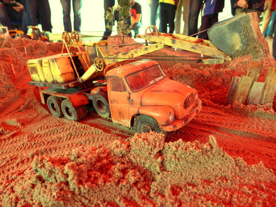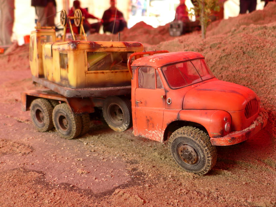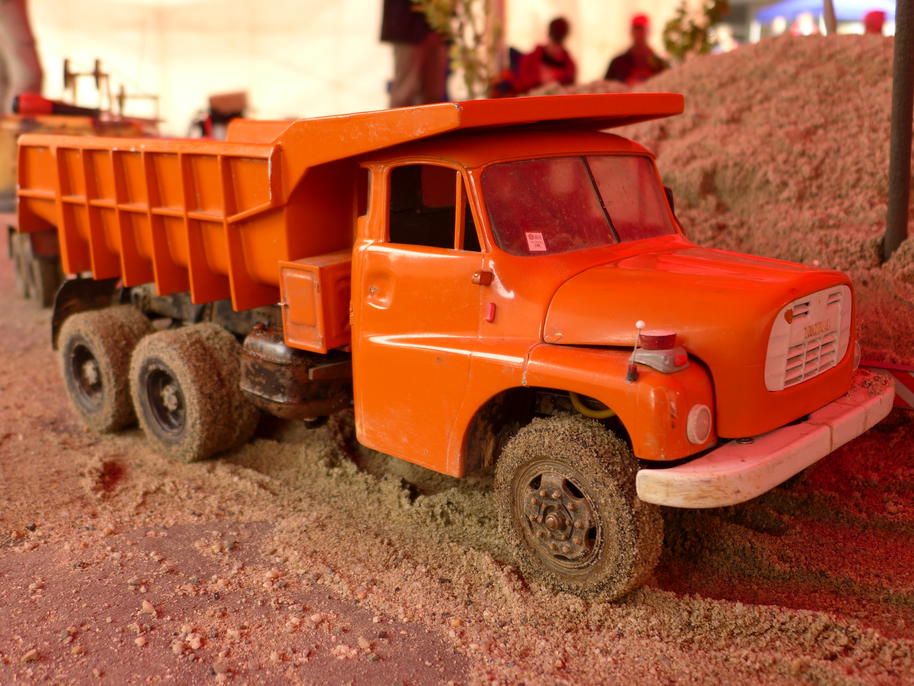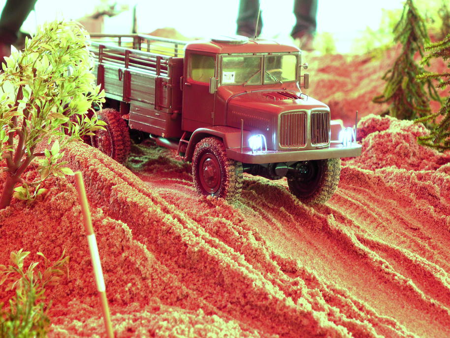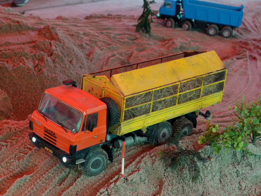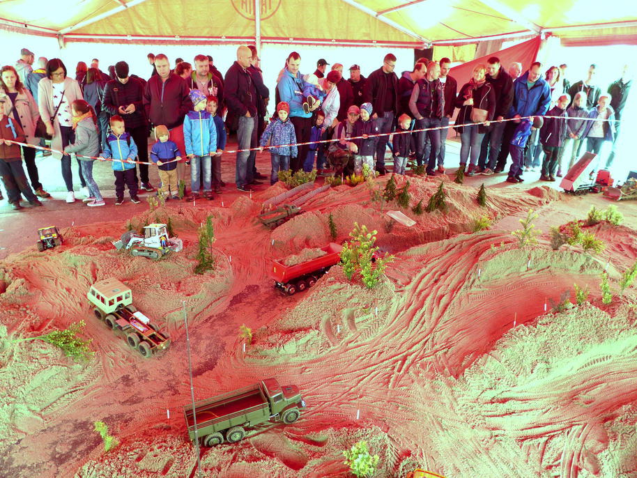 Měli jsme k dispozici mokrý písek, který vlivem vlhkého počasí (celou noc na neděli pršelo) zůstal sjízdný i v neděli. Navíc tentokrát jsme terén rozdělili na několik velkých hromad, mezi nimiž byly cesty tvořené přímo podkladovým asfaltem. To umožnilo v podstatě všem vozidlům pohyb v modelové krajině. Dokonce i návěsový tahač Volvo zvládal průjezd, pokud se jeho řidič obezřetně vyhýbal hromádkám písku ;) .