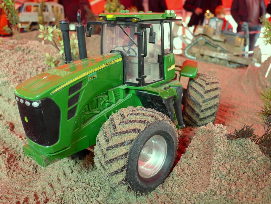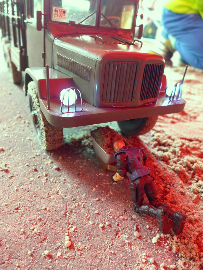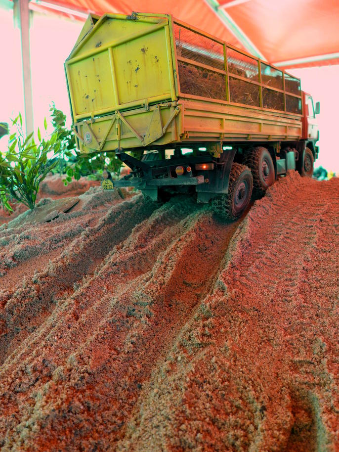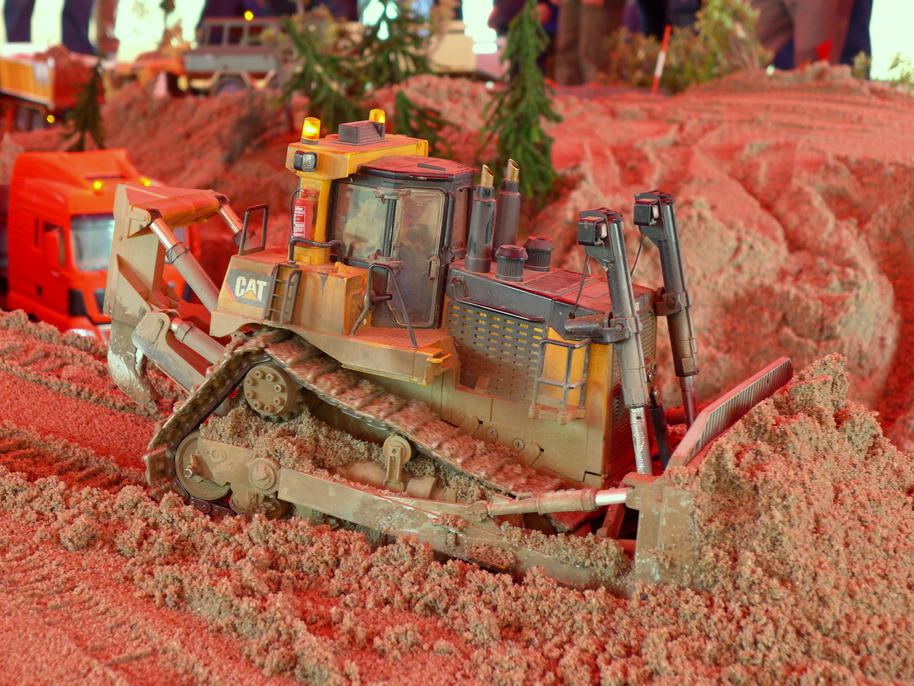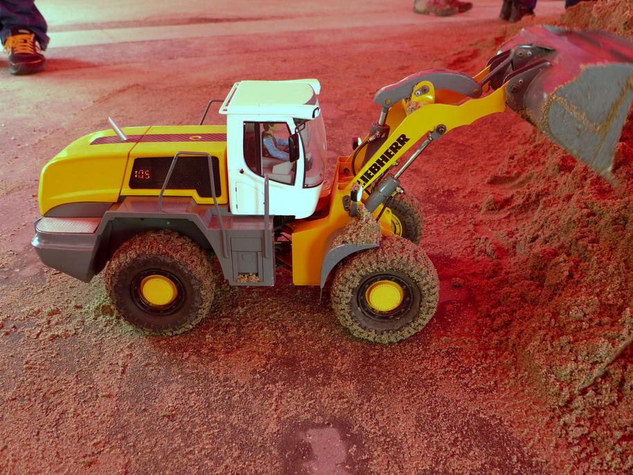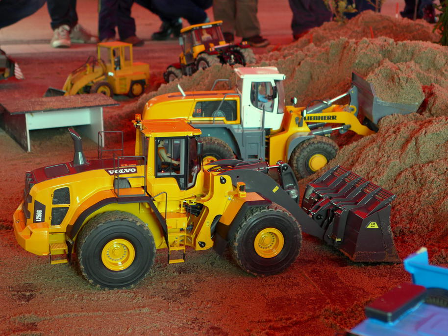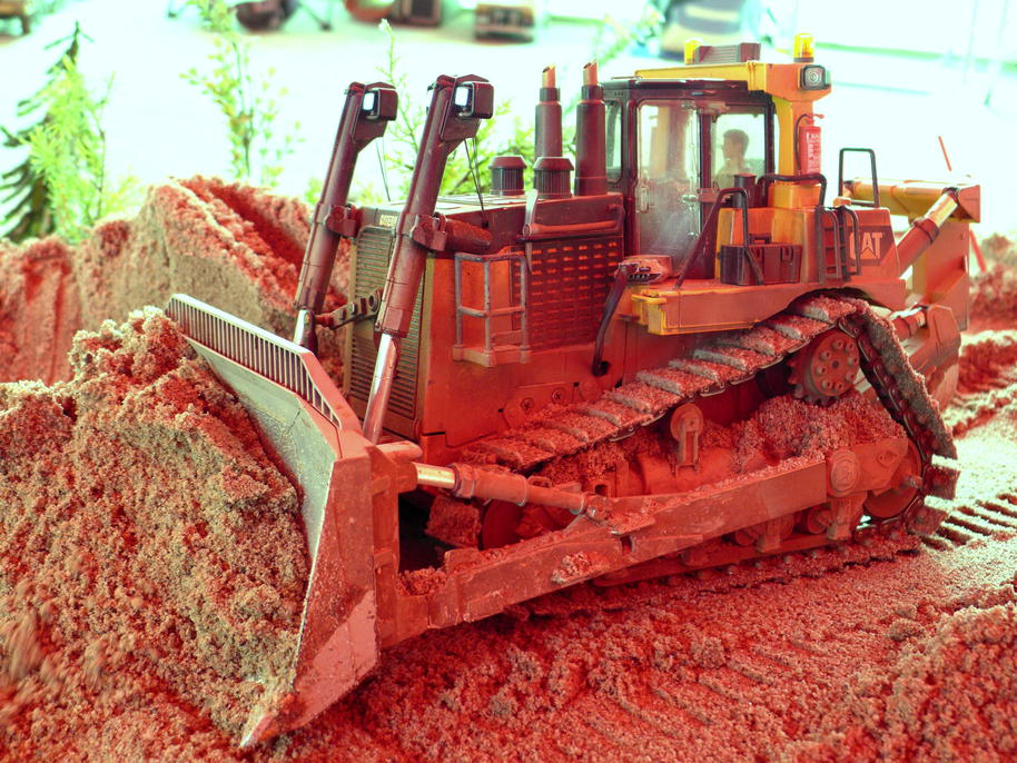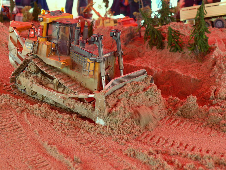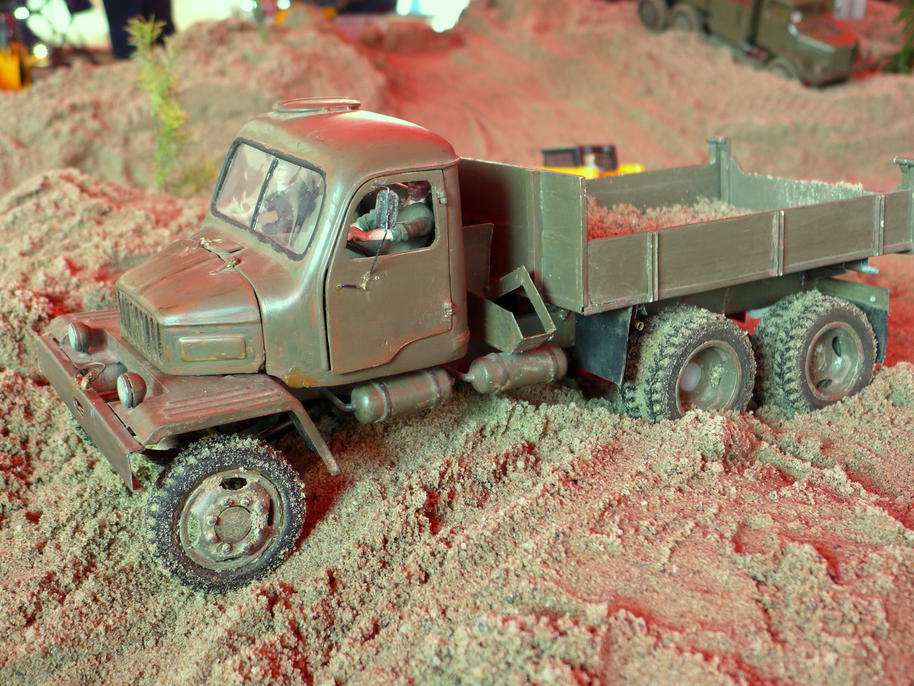 Měli jsme k dispozici mokrý písek, který vlivem vlhkého počasí (celou noc na neděli pršelo) zůstal sjízdný i v neděli. Navíc tentokrát jsme terén rozdělili na několik velkých hromad, mezi nimiž byly cesty tvořené přímo podkladovým asfaltem. To umožnilo v podstatě všem vozidlům pohyb v modelové krajině. Dokonce i návěsový tahač Volvo zvládal průjezd, pokud se jeho řidič obezřetně vyhýbal hromádkám písku ;) .