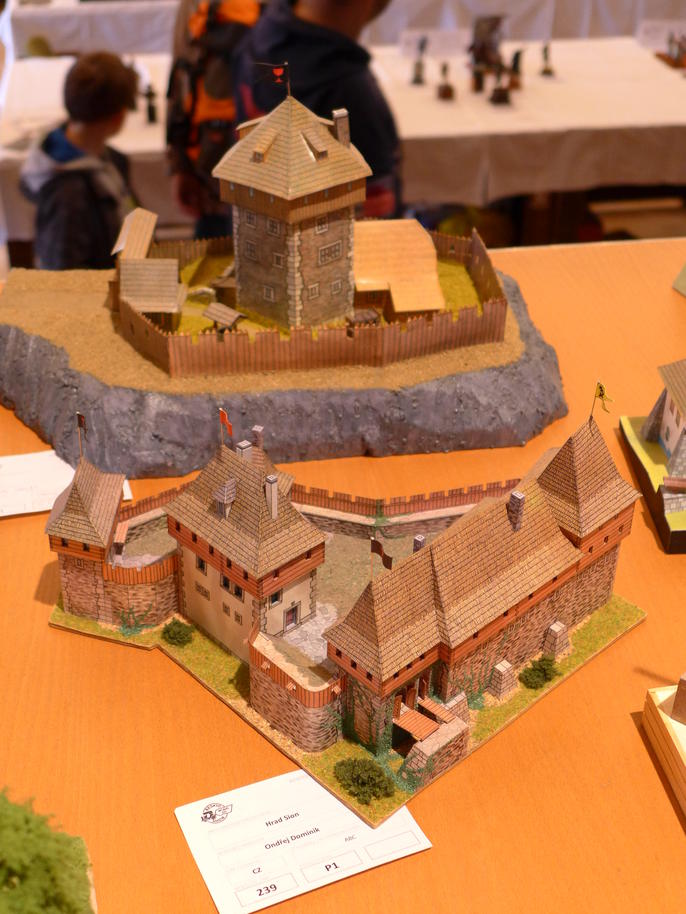 Dnes již klasický model hradu Sion, papírové modely železniční techniky