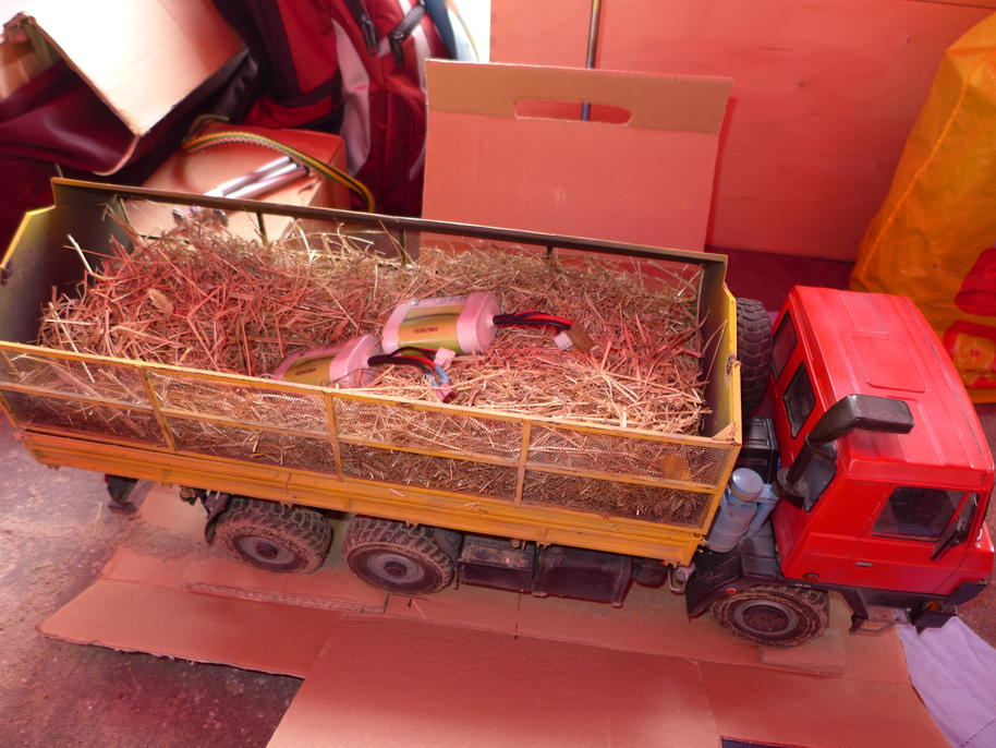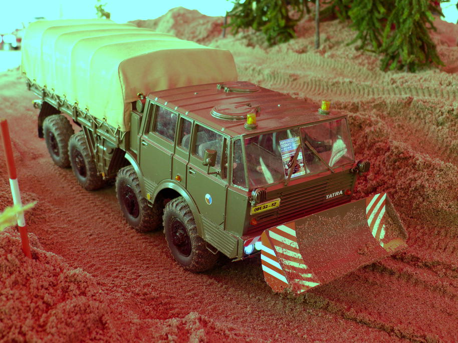 V neděli naši sestavu doplnil Standa s Kolosem. Model Kolosa má v terénu překvapivě problémy. Jeho nepoddajné listové pružiny neumožňují vykrývání příčných "křížení" přední a zadní části vozu, takže se musí velmi pečlivě volit cesta terénem, aby se některé z předních kol neodlehčilo a neztratilo záběr. Ve skutečnosti to samozřejmě řeší uzávěrky na všech nápravách, ale model má přední diferenciály otevřené. Částečným řešením by bylo vyrobit pružnější pera , což T130 docela prospělo. Kdyby bylo odpružení vzduchovými vaky, tyto problémy by odpadly zcela, což je krásně vidět na Agrovce.